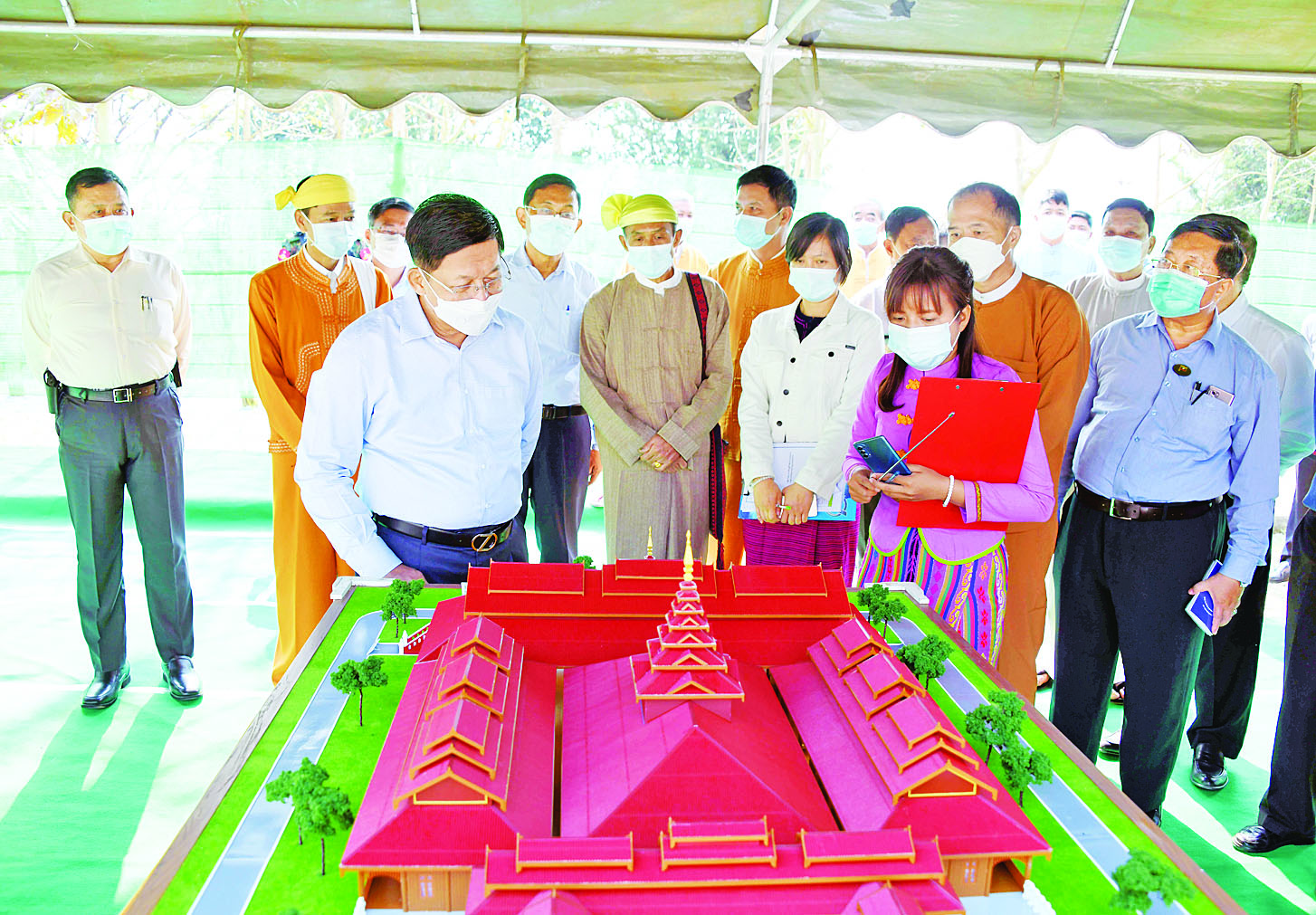 ထို့နောက် ဟော်နန်းပုံစံငယ်များကို ကြည့်ရှုရာ ဟော်နန်းပြန်လည်တည်ဆောက်ရေး လုပ်ငန်း တာဝန်ခံ မြို့မိမြို့ဖ ဦးစိုင်းဝင်းခိုင်၊ မနန်းလောင်ခေးနှင့် စစ်အင်ဂျင်နီယာညွှန်ကြားရေးမှူးရုံး ညွှန်ကြား ရေးမှူးဗိုလ်ချုပ် မျိုးသန့်တို့က လုပ်ငန်းဆောင်ရွက် နေမှုအခြေအနေ၊ ပြီးစီးမှုအခြေအနေနှင့် ဆက်လက် ဆောင်ရွက်သွားမည့် အခြေအနေများကိုရှင်းလင်းတင်ပြကြသည်။