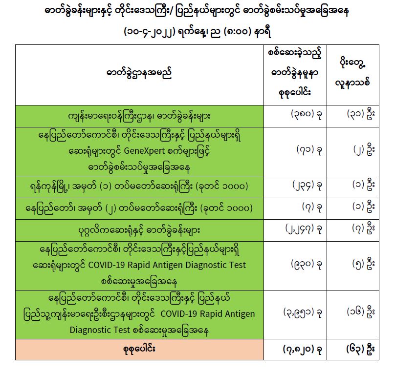 သို့ဖြစ်ပါ၍ ယနေ့အထိ ဓာတ်ခွဲနမူနာစုစုပေါင်း (၇,၇၈၂,၀၃၃) ခုအား စစ်ဆေးခဲ့ပြီး COVID-19 ဓာတ်ခွဲအတည်ပြုလူနာ စုစုပေါင်း (၆၁၂,၃၄၁) ဦး ရှိပြီ ဖြစ်ပါသည်။