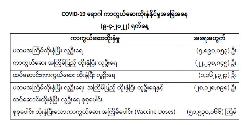 COVID-19 ရောဂါ ကာကွယ်ထိန်းချုပ်ရေးအတွက် တိုင်းဒေသကြီး/ပြည်နယ်များတွင် COVID-19 ရောဂါကာကွယ်ဆေးကို ဦးတည်အုပ်စုများသတ်မှတ်၍ ထိုးနှံပေးလျက်ရှိရာ (၉-၄-၂၀၂၂) ရက်နေ့ အထိ လူဦးရေ စုစုပေါင်း (၂၈,၁၂၈,၈၉၈) ဦးအား ထိုးနှံပေးပြီးဖြစ်၍ ပထမအကြိမ်ထိုးနှံပြီးစီးသူ (၅,၈၉၀,၀၅၃) ဦး၊ ကာကွယ်ဆေးအကြိမ်ပြည့် ထိုးနှံပြီးစီးသူ (၂၂,၂၃၈,၈၄၅) ဦးနှင့် ထပ်ဆောင်း ကာကွယ်ဆေး ထိုးနှံပြီးစီးသူ (၁,၁၆၂,၃၂၃) ဦး ရှိပြီဖြစ်ပါသည်။ သို့ဖြစ်ပါ၍ (၉-၄-၂၀၂၂) ရက်နေ့ အထိ မြန်မာနိုင်ငံတွင် COVID-19 ရောဂါကာကွယ်ဆေး အကြိမ်ရေ စုစုပေါင်း (၅၁,၅၃၀,၀၆၆) ကြိမ် ထိုးနှံပြီး ဖြစ်ပါသည်။