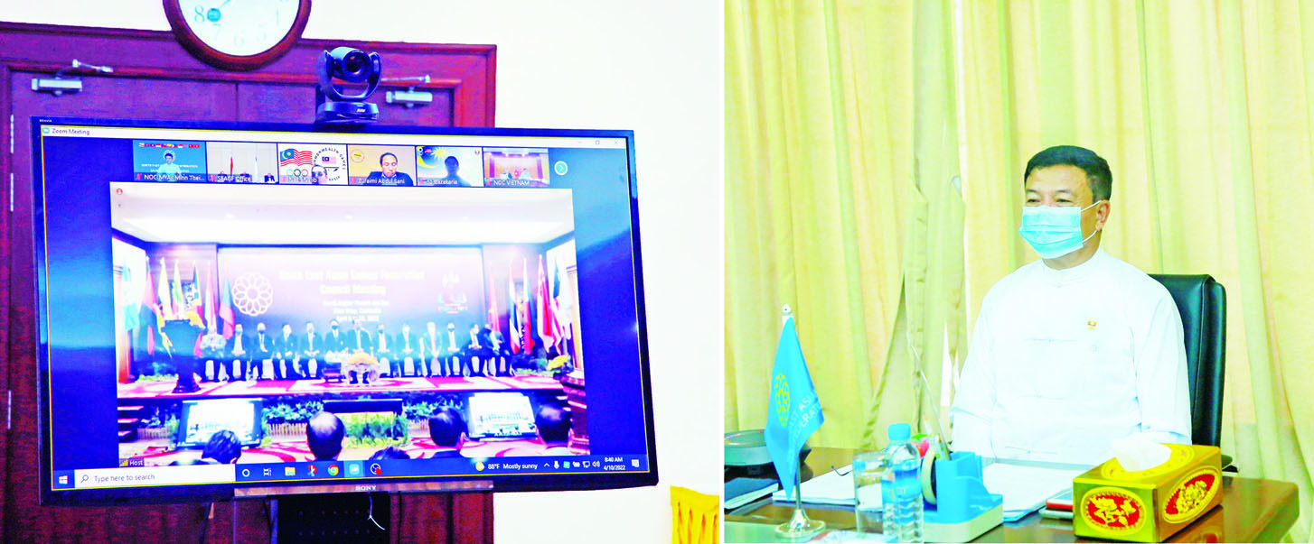 ကမ္ဘောဒီးယားနိုင်ငံ Borei Angkor Resort andSpa ၌ ယနေ့ နံနက် ၈ နာရီခွဲက ကျင်းပသည့် SEAGF COUNCILအစည်းအဝေးသို့မြန်မာနိုင်ငံ အိုလံပစ် ကော်မတီဥက္ကဋ္ဌ အားကစားနှင့်လူငယ်ရေးရာ ဝန်ကြီးဌာနပြည်ထောင်စုဝန်ကြီးဦးမင်းသိန်းဇံ၊ အားကစားနှင့်ကာယပညာဦးစီးဌာန ညွှန်ကြားရေးမှူးချုပ် ဦးထွန်းမြင့်ဦး၊ ယှဉ်ပြိုင်ရေးနှင့် လေ့ကျင့်ရေးဌာနခွဲ(၁)ညွှန်ကြားရေးမှူးဦးခွန်ဂျာအောင်၊ SOUTH EAST ASIAN GAMES FEDERATION မှ တာဝန်ရှိသူများနှင့် SEAGF COUNCIL အဖွဲ့ဝင်များက နေပြည်တော် ဝဏ္ဏသိဒ္ဓိအားကစားကွင်း အစည်းအဝေးခန်းမမှ ဗီဒီယိုကွန်ဖရင့်စနစ်ဖြင့် တက်ရောက်ကြသည်။