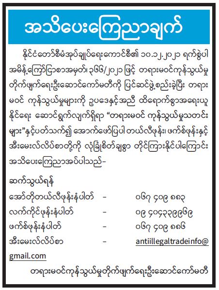 စက်သုံးဆီဖြန့်ဖြူးရောင်းချမှုနှင့်ပတ်သက်၍ ပြည်သူသို့ အသိပေးပန်ကြားချက်