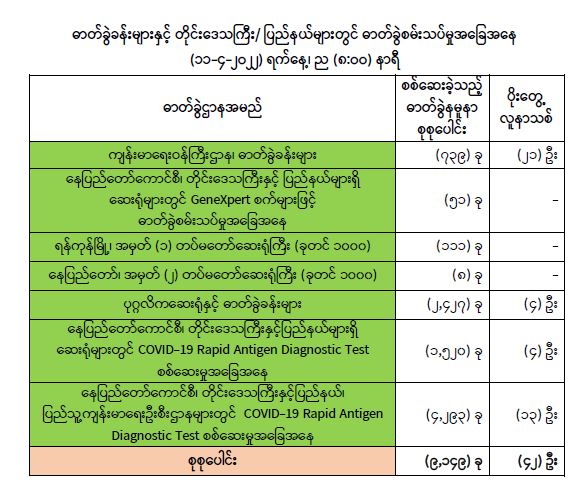 သို့ဖြစ်ပါ၍ ယနေ့အထိ ဓာတ်ခွဲနမူနာစုစုပေါင်း(၇,၇၉၁,၁၈၂) ခုအားစစ်ဆေးခဲ့ပြီး COVID-19 ဓာတ်ခွဲ အတည်ပြုလူနာ စုစုပေါင်း (၆၁၂,၃၈၃) ဦး ရှိပြီ ဖြစ်ပါသည်။