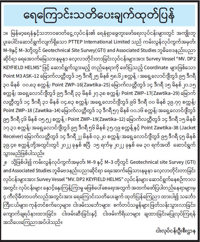 စက်သုံးဆီဖြန့်ဖြူးရောင်းချမှုနှင့်ပတ်သက်၍ ပြည်သူသို့ အသိပေးပန်ကြားချက်