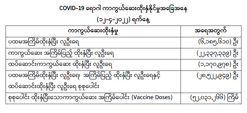 COVID-19 ရောဂါ ကာကွယ်ထိန်းချုပ်ရေးအတွက် တိုင်းဒေသကြီး/ပြည်နယ်များတွင် COVID-19 ရောဂါ ကာကွယ်ဆေးကို ဦးတည်အုပ်စုများသတ်မှတ်၍ ထိုးနှံပေးလျက်ရှိရာ (၁၂-၄-၂၀၂၂) ရက်နေ့ အထိ လူဦးရေ စုစုပေါင်း (၂၈,၅၂၂,၉၄၉) ဦးအား ထိုးနှံပေးပြီးဖြစ်၍ ပထမအကြိမ်ထိုးနှံပြီးစီးသူ (၆,၁၈၅,၆၁၀) ဦး၊ ကာကွယ်ဆေးအကြိမ်ပြည့် ထိုးနှံပြီးစီးသူ (၂၂,၃၃၇,၃၃၉) ဦးနှင့် ထပ်ဆောင်း ကာကွယ်ဆေး ထိုးနှံပြီးစီးသူ (၁,၁၇၀,၉၇၈) ဦး ရှိပြီဖြစ်ပါသည်။ သို့ဖြစ်ပါ၍ (၁၂-၄-၂၀၂၂) ရက်နေ့ အထိ မြန်မာနိုင်ငံတွင် COVID-19 ရောဂါကာကွယ်ဆေး အကြိမ်ရေ စုစုပေါင်း (၅၂,၀၃၁,၂၆၆) ကြိမ် ထိုးနှံပြီးဖြစ်ပါသည်။