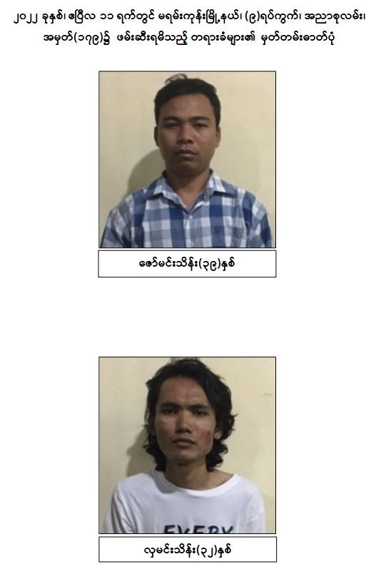 သို့ဖြစ်ပါ၍ ဖမ်းဆီးရမိတရားခံများအား ဥပဒေအရထိရောက်စွာ အရေးယူနိုင်ရေး ဆက်လက်ဆောင်ရွက်သွားမည်ဖြစ်ပြီး အကြမ်းဖက်မှုဆောင်ရွက်နေသူများအား ပြည်သူတစ်ရပ်လုံးက ဝိုင်းဝန်း ကာကွယ်တိုက်ဖျက်ကြရန်နှင့် ပြစ်မှုကျူးလွန်ရာတွင် ပါဝင်ပတ်သက်သူများ၊ နောက်ကွယ်မှ ထောက်ပံ့ပေးလျက်ရှိသော ဆက်စပ်တရားခံများအား အမြန်ဆုံးဖမ်းဆီးရမိရေးအတွက် ၎င်းတို့ပုန်းခိုရာ နေရာများ၊ လှုပ်ရှားသွားလာနေထိုင်မှု သတင်းများရရှိပါက သက်ဆိုင်ရာသို့ လျှို့ဝှက်စွာသတင်းပေး တိုင်ကြားနိုင်ပါကြောင်း၊ သတင်းပေးသူနှင့် ဖမ်းဆီးပေးသူများအား ထိုက်တန်စွာ လျှို့ဝှက်၍ ဆုငွေများ ချီးမြှင့်ပေးမည်ဖြစ်ကြောင်းနှင့် မြို့ရွာများအမြန်ဆုံး အေးချမ်းတည်ငြိမ်ရေးအတွက် ပြည်သူတစ်ရပ်လုံး ပူးပေါင်းပါဝင်ကြိုးပမ်းဆောင်ရွက်နိုင်ပါရန် မေတ္တာရပ်ခံအပ်ပါကြောင်း အသိပေးသတင်းထုတ်ပြန်အပ် ပါသည်။
