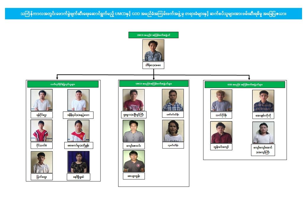 ထို့အပြင် တရားခံများ၏ ထွက်ဆိုချက်အရ Union Myanmar civil Development (UMCD) အမည်ခံအကြမ်းဖက်အဖွဲ့အား ၂၀၂၁ ခုနှစ်၊ သြဂုတ်လခန့်တွင် ထိုင်းနိုင်ငံသို့ တိမ်းရှောင်နေသော ဖမ်းဆီးရန်ကျန်တရားခံ မာရီယာနှင့် သီရိဝေ(ခ) မဝေတို့ခေါင်းဆောင်၍ ရှမွေလှ(ခ)ဦးရှင်ကြီး၊ ကျော်ဇောဝင်း၊ ဇေယျာထွန်း၊ ဇော်မင်းသိန်း၊ လှမင်းသိန်းနှင့် ဖမ်းဆီးရန်ကျန်တရားခံ အမ်မာ၊ မျောက်၊ ခင်မောင်လင်း (ခ)ကိုလင်း၊ ကြယ်ခေါင်၊ ဆိုဖီယာ၊ ကိုဇန်၊ ရိန်းဂျား၊ ပင်လယ်တို့ပါဝင်သော အင်အား ၁၀၀ ဦးခန့်ဖြင့်လည်းကောင်း၊ God of Death(GOD) အမည်ခံ အကြမ်းဖက်အဖွဲ့အား ၂၀၂၁ ခုနှစ်၊ အောက်တိုဘာလခန့်တွင် ဖမ်းဆီးရန်ကျန် တရားခံ စိုးလေးခေါင်းဆောင်၍ သက်ပိုင်စိုး၊ ထွန်းမင်းကျော်၊ အေးချမ်းကိုကို၊ ကျော်ကျော်အောင်(ခ) ကျော်ကြီးတို့ပါဝင်သော အဖွဲ့ဝင် ၃၀ ဦးခန့်ဖြင့် လည်းကောင်း အသီးသီးဖွဲ့စည်းခဲ့ကြောင်း ဖော်ထုတ်သိရှိရသည်။