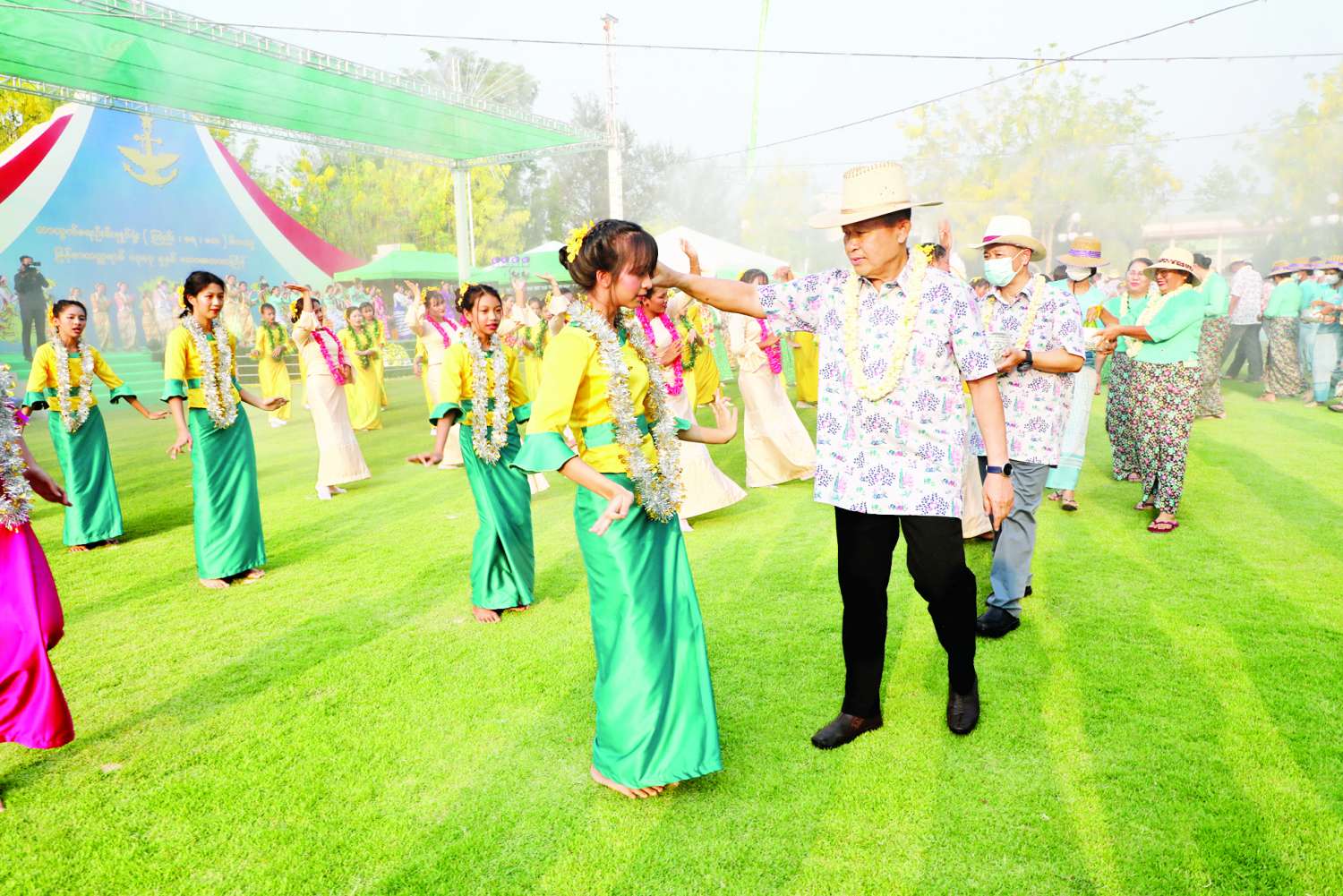 ယင်းနောက် ယိမ်းအဖွဲ့သမီးပျိုများက “မင်္ဂလာရှိသောသင်္ကြန်” သီချင်းဖြင့် ကပြဖျော်ဖြေကြရာ ဖွင့်ပွဲအခမ်းအနားတက်ရောက်လာကြသူများက ယိမ်းအဖွဲ့များနှင့် ဧည့်ပရိသတ်များကို အောင်သပြေ ခက်ဖြင့် အတာရေပက်ဖျန်းပေးကြသည်။