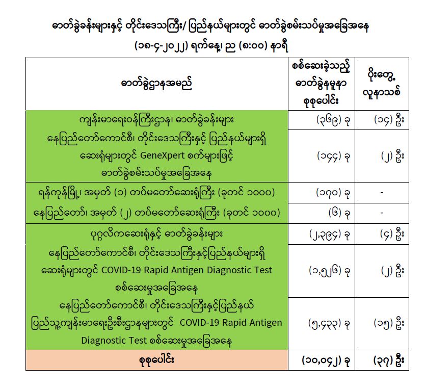 သို့ဖြစ်ပါ၍ ယနေ့အထိ ဓာတ်ခွဲနမူနာစုစုပေါင်း (၇,၈၃၈,၅၅၂) ခုအားစစ်ဆေးခဲ့ပြီး COVID-19 ဓာတ်ခွဲအတည်ပြုလူနာ စုစုပေါင်း (၆၁၂,၆၀၂) ဦး ရှိပြီ ဖြစ်ပါသည်။