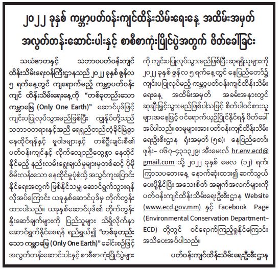 ၂၀၂၂ ခုနှစ် ကမ္ဘာ့ပတ်ဝန်းကျင်ထိန်းသိမ်းရေးနေ့ အထိမ်းအမှတ် အလွတ်တန်းဆောင်းပါးနှင့် စာစီစာကုံးပြိုင်ပွဲအတွက် ဖိတ်ခေါ်ခြင်း 04/22/2022