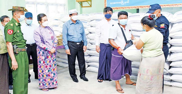 ဦးစွာ ပြည်ထောင်စုဝန်ကြီး၊ တိုင်းဒေသကြီးဝန်ကြီးချုပ်၊ တိုင်းမှူးနှင့်တာဝန်ရှိသူများက သာကေတ မြို့နယ်၊ (၁၀)တောင်ရပ်ကွက်ရှိ အမှတ်(၆)အခြေခံပညာ အထက်တန်းကျောင်း၌ လည်းကောင်း၊ (၁၀)မြောက်ရပ်ကွက်ရှိ သာသနာ့သောပိတဓမ္မာရုံ၌ လည်းကောင်း၊ (၄)မြောက်ရပ်ကွက်ရှိ သဗ္ဗမင်္ဂလာ ဓမ္မာရုံ၌ လည်းကောင်း၊ ဒဂုံမြို့သစ်(အရှေ့ပိုင်း)မြို့နယ်၊ အမှတ်(၁၃)ရပ်ကွက်ရှိ ဓမ္မာရုံ၌ လည်းကောင်း အိန္ဒိယအစိုးရမှ မြန်မာနိုင်ငံသို့ လှူဒါန်းသော ဆန်နှင့်ဂျုံများကို အဆိုပါမြို့နယ်များရှိ ပြည်သူများ လက်ဝယ်အရောက် ထောက်ပံ့ပေးနေမှုများအား သွားရောက်ကြည့်ရှု စစ်ဆေးသည်။