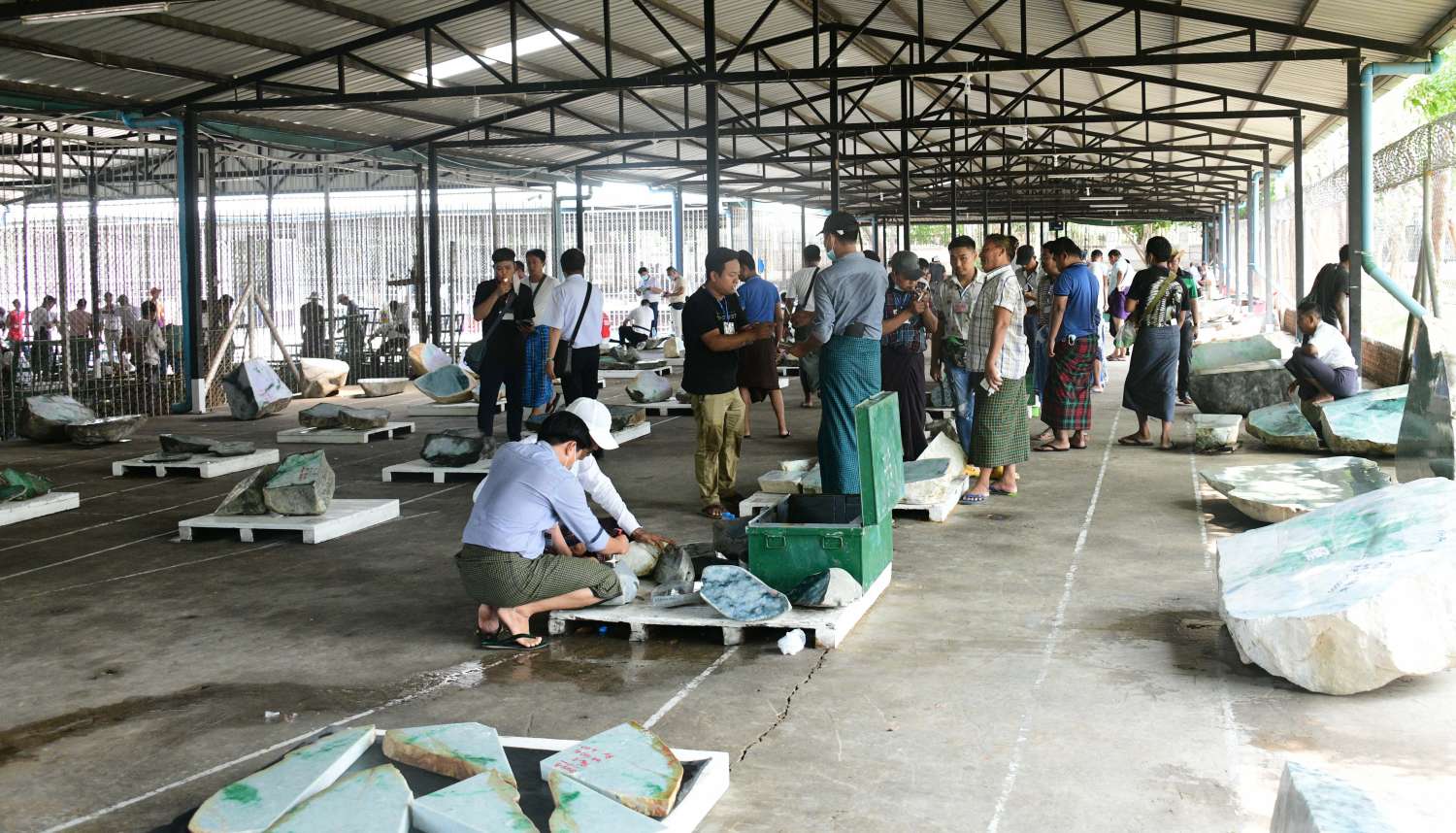 မွန်းလွဲပိုင်းတွင် မြန်မာ့ကျောက်မျက်ရတနာပြပွဲ ဗဟိုကော်မတီနာယက သယံဇာတနှင့် သဘာဝပတ်ဝန်းကျင်ထိန်းသိမ်းရေးဝန်ကြီးဌာန ပြည်ထောင်စုဝန်ကြီး ဦးခင်မောင်ရီနှင့် ပြပွဲဗဟိုကော်မတီဝင်များသည် မဏိရတနာကျောက်စိမ်းခန်းမအတွင်းရှိ ကျောက်စိမ်းအတွဲများ အိတ်ဖွင့်တင်ဒါစနစ်ဖြင့် ရောင်းချပေးနေမှုကို ကြည့်ရှုအားပေးသည်။