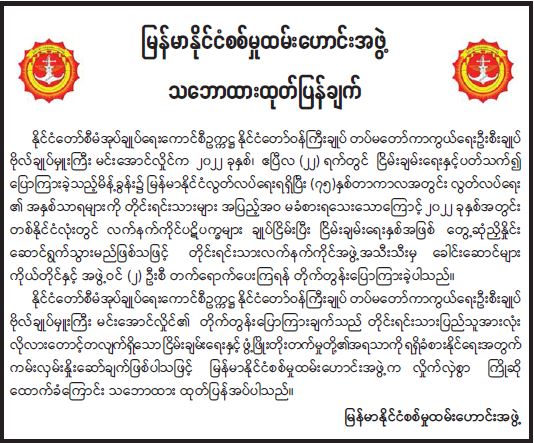 နိုင်ငံတော်စီမံအုပ်ချုပ်ရေးကောင်စီဥက္ကဋ္ဌ နိုင်ငံတော်ဝန်ကြီးချုပ် တပ်မတော်ကာကွယ်ရေးဦးစီးချုပ် ဗိုလ်ချုပ်မှူးကြီးမင်းအောင်လှိုင်၏ ငြိမ်းချမ်းရေးနှင့်ပတ်သက်၍ ပြောကြားသည့်မိန့်ခွန်းကို ကြိုဆိုထောက်ခံကြောင်း မြန်မာနိုင်ငံစစ်မှုထမ်းဟောင်းအဖွဲ့ သဘောထားထုတ်ပြန်ချက်