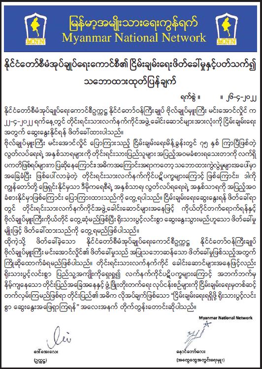 နိုင်ငံတော်စီမံအုပ်ချုပ်ရေးကောင်စီ၏ ငြိမ်းချမ်းရေးဖိတ်ခေါ်မှုနှင့်ပတ်သက်၍ မြန်မာအမျိုးသားရေးကွန်ရက်၏ သဘောထားထုတ်ပြန်ချက် 04/27/2022