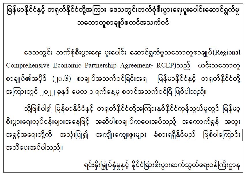 မြန်မာနိုင်ငံနှင့် တရုတ်နိုင်ငံတို့အကြား ဒေသတွင်းဘက်စုံစီးပွားရေးပူးပေါင်းဆောင်ရွက်မှု သဘောတူစာချုပ်စတင်အသက်ဝင်