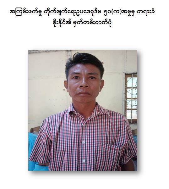 ရန်ကုန်တိုင်းဒေသကြီး၊ လှိုင်သာယာ (အရှေ့ပိုင်း) မြို့နယ်၊ အမှတ်(၇) ရပ်ကွက်နေ စိုးနိုင် (ဘ) ဦးစောသည် ၂၀၂၁ ခုနှစ်၊ ဖေဖော်ဝါရီလမှ ၂၀၂၂ ခုနှစ်၊ ဖော်ဝါရီလ ၁၂ ရက်အတွင်း လှိုင်သာယာ (အနောက်ပိုင်း) မြို့နယ်အတွင်းပြုလုပ်သည့် ဆူပူဆန္ဒပြမှုများတွင် ကိုယ်တိုင်ပါဝင်ခြင်း၊ ပြည်ထောင်စုသမ္မတမြန်မာနိုင်ငံတော်၊ အကြမ်းဖက်မှု တိုက်ဖျက်ရေး ဗဟိုအဖွဲ့၏ အမိန့်ကြော်ငြာစာအမှတ်(၂/၂၀၂၁)ဖြင့် အကြမ်းဖက် အုပ်စုများအဖြစ် သတ်မှတ်ကြေညာ ထားသည့် အဖွဲ့အစည်းများနှင့် ဆက်သွယ်ခြင်း၊ လက်လုပ်မိုင်းများ စမ်းသပ်ထုတ်လုပ်ပေးခြင်း၊ လက်နက်၊ ခဲယမ်းများသယ်ယူ ပို့ဆောင်ပေးခြင်းကြောင့်လည်းကောင်း၊ လှိုင်သာယာ (အနောက်ပိုင်း) မြို့နယ်၊ အမှတ် (၁၈) ရပ်ကွက်နေ ကျော်ဝင်းထွဋ် (ခ) ကျော်ကြီး (ဘ) ဦး တက်နေဝင်း၊ အမှတ်(၁၆) ရပ်ကွက်နေ ဖြိုးကိုကို(ခ)ဖြိုးကို(ဘ)ဦးထွန်းမင်းနှင့် သက်ပိုင်ဦး(ခ) ပိုင်လေးတို့ ၃ ဦးသည် လှိုင်သာယာမြို့နယ်အတွင်းပြုလုပ်သည့် ဆူပူဆန္ဒပြမှုများတွင် ကိုယ်တိုင် ပါဝင်ခြင်း၊ လက်နက်များသိုဝှက်သိမ်းဆည်းခြင်း၊ တိုင်းရင်းသားလက်နက်ကိုင်အဖွဲ့ နယ်မြေ အတွင်း၌ အကြမ်းဖက်သင်တန်းများ တက်ရောက်ခဲ့ခြင်းတို့ကြောင့်လည်းကောင်း၊ ရွှေပြည်သာ မြို့နယ်၊ အမှတ်(၂၃)ရပ်ကွက်နေ ခိုင်ဝင်းစိုး (ခ) ထိန်လင်း(ခ) ကိုထက်(ဘ)ဦးမြင့်မောင်၊ ဘုန်းမြင့်ဝင်း (ခ) ဒင်္ဂါး(ခ) ကျော်ကြီး (ဘ) ဦးမောင်မောင်ထွေး၊ မျိုးဦး(ဘ)ဦးမျိုးညွန့်အောင်နှင့် မှော်ဘီမြို့နယ်၊ အုတ်စက်အလုပ်သမားဝန်းနေ ခိုင်ထွန်းဦး (ခ) စောမိုးဇက် (ခ) ချက်ကြီး(ဘ) ဦးစိန်ထွန်းရီတို့ ၄ ဦးသည် ၂၀၂၁ ခုနှစ်၊ ဖေဖော်ဝါရီလအတွင်း ရွှေပြည်သာမြို့နယ်အတွင်း ပြုလုပ်သည့် ဆူပူဆန္ဒပြမှုများ တွင်ပါဝင်ခြင်း၊ ပြည်ထောင်စုသမ္မတမြန်မာနိုင်ငံတော်၊ အကြမ်းဖက်မှု တိုက်ဖျက်ရေးဗဟိုအဖွဲ့၏ အမိန့်ကြော်ငြာစာအမှတ်(၂/၂၀၂၁)ဖြင့် အကြမ်းဖက်အုပ်စုများအဖြစ် သတ်မှတ်ကြေညာထားသည့် အဖွဲ့အစည်းများနှင့် ဆက်သွယ်ခြင်း၊ လက်နက်၊ ခဲယမ်းများ သိုဝှက်သိမ်းဆည်းပေးခြင်းနှင့် ပို့ဆောင်ပေးခြင်းများ ကြောင့် လည်းကောင်း၊ ဧရာဝတီတိုင်းဒေသကြီး၊ ပန်းတနော်မြို့နယ်၊ မိန်းမပြေးကျေးရွာနေ ကျော်ဇော(ခ)ဂြိုလ်သား(ဘ)ဦးထွန်းအောင်သည် ၂၀၂၁ ခုနှစ်၊ ဖေဖော်ဝါရီလမှ ၂၀၂၂ ခုနှစ်၊ မတ် ၈ ရက်အတွင်း မြောက်ဥက္ကလာပမြို့နယ်အတွင်း ပြုလုပ်သည့် ဆူပူဆန္ဒပြမှုများတွင် ကိုယ်တိုင် ပါဝင်ခြင်း၊ ဖောက်ခွဲဖျက်ဆီးရေးလုပ်ငန်းများ လုပ်ကိုင်ရာတွင်အားပေးကူညီခြင်း တို့ကြောင့် လည်းကောင်း စစ်အုပ်ချုပ်ရေး (Martial Law) စစ်ခုံရုံးဖွဲ့၍ စစ်ဆေးမှုများ ဆောင်ရွက်ခဲ့ရာ အကြမ်းဖက်မှုတိုက်ဖျက်ရေးဥပဒေပုဒ်မ ၅၀(က)နှင့် ၅၀(ဈ)တို့အရ ၂၀၂၂ ခုနှစ်၊ ဧပြီ ၂၉ ရက်တွင် “ထောင်ဒဏ်တစ်သက်”