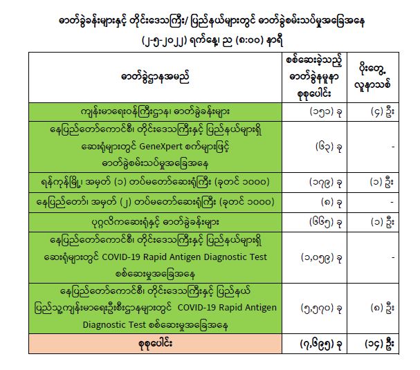 သို့ဖြစ်ပါ၍ ယနေ့အထိ ဓာတ်ခွဲနမူနာစုစုပေါင်း (၇,၉၇၀,၄၀၈) ခုအားစစ်ဆေးခဲ့ပြီး COVID-19 ဓာတ်ခွဲအတည်ပြုလူနာ စုစုပေါင်း (၆၁၂,၉၁၄) ဦး ရှိပြီ ဖြစ်ပါသည်။