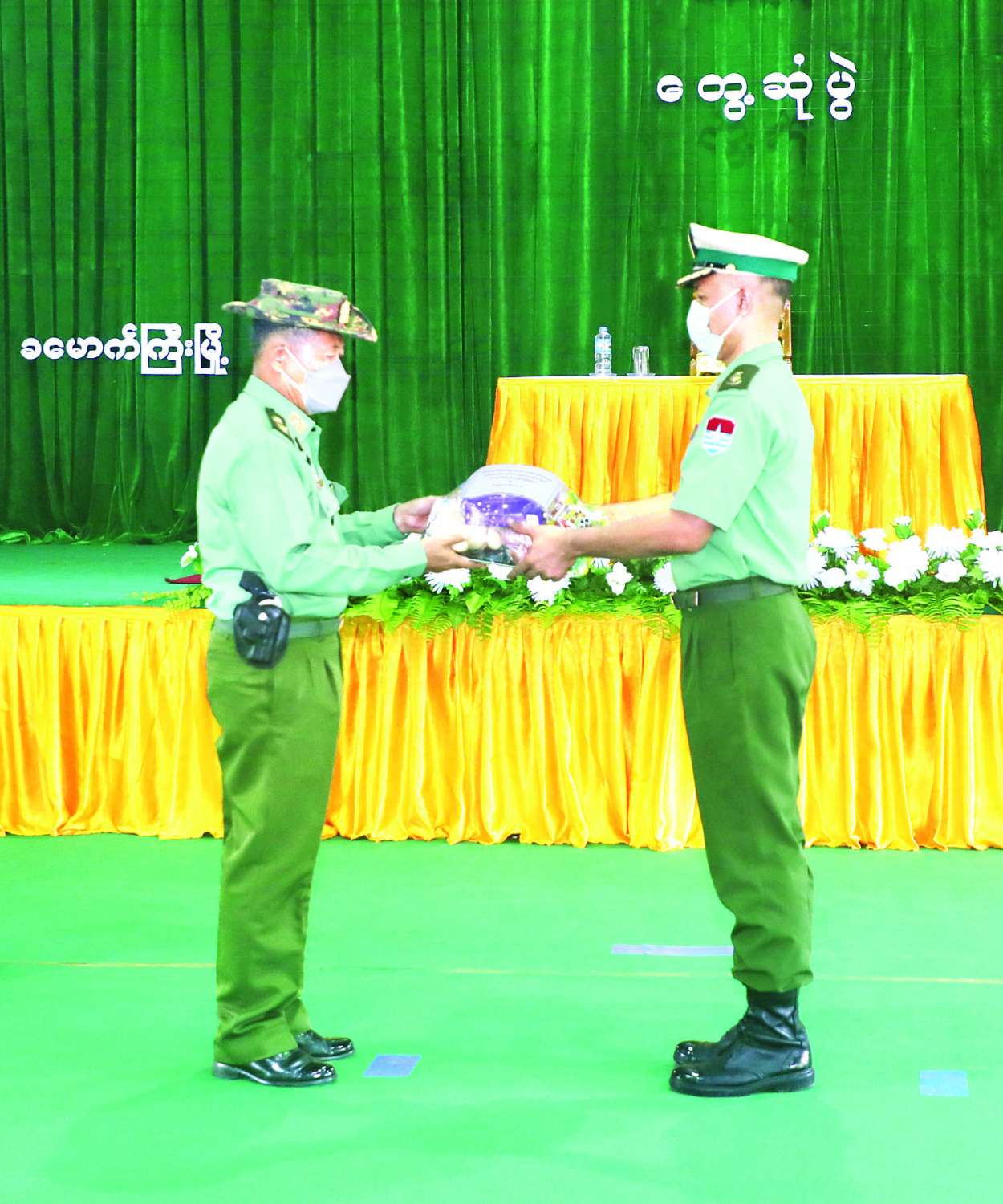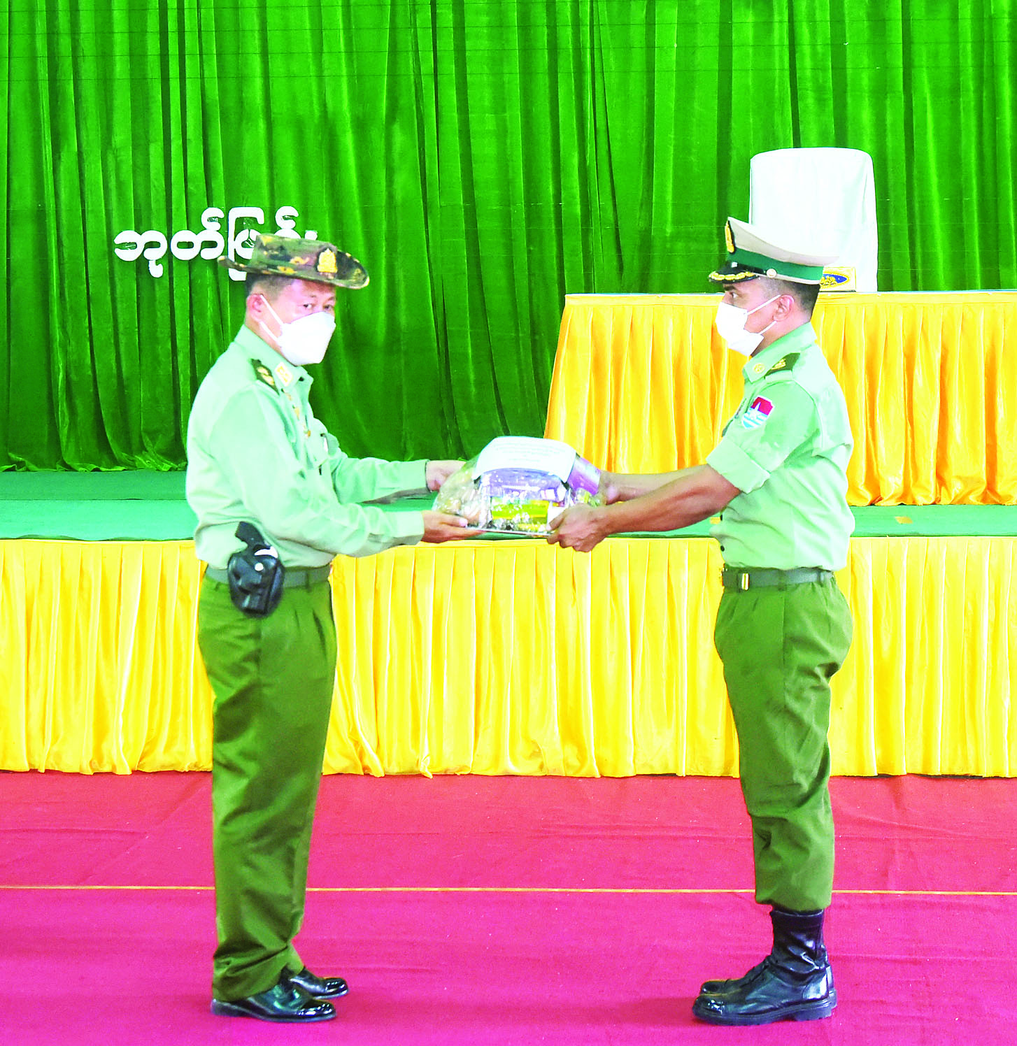 ထို့နောက် နိုင်ငံတော်စီမံအုပ်ချုပ်ရေးကောင်စီ ဒုတိယဥက္ကဋ္ဌ၊ ဒုတိယတပ်မတော် ကာကွယ်ရေးဦးစီးချုပ်၊ ကာကွယ်ရေးဦးစီးချုပ်(ကြည်း)သည် အရာရှိ၊ စစ်သည်။ မိသားစုများအတွက် စားသောက်ဖွယ်ရာပစ္စည်းများပေးအပ်ရာ တာဝန်ရှိသူတို့က လက်ခံရယူကြသည်။