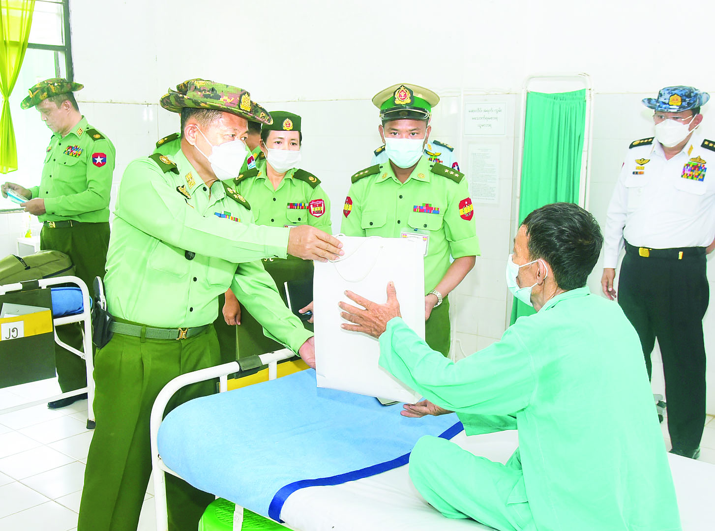 ဆက်လက်၍ နိုင်ငံတော်စီမံအုပ်ချုပ်ရေးကောင်စီ ဒုတိယဥက္ကဋ္ဌ ဒုတိယတပ်မတော် ကာကွယ်ရေးဦးစီးချုပ် ကာကွယ်ရေးဦးစီးချုပ်(ကြည်း) ဒုတိယဗိုလ်ချုပ်မှူးကြီး စိုးဝင်းသည် အဖွဲ့ဝင်များနှင့်အတူ ယနေ့ မွန်းလွဲပိုင်းတွင် ဘုတ်ပြင်းမြို့ရှိ တပ်မတော်ဆေးရုံ၌ တက်ရောက်ဆေးကုသမှု ခံယူလျက်ရှိသည့် အရာရှိ၊ စစ်သည်၊ မိသားစုများနှင့် ပြည်သူများအား သွားရောက်ကြည့်ရှု အားပေးစကားပြောကြားသည်။