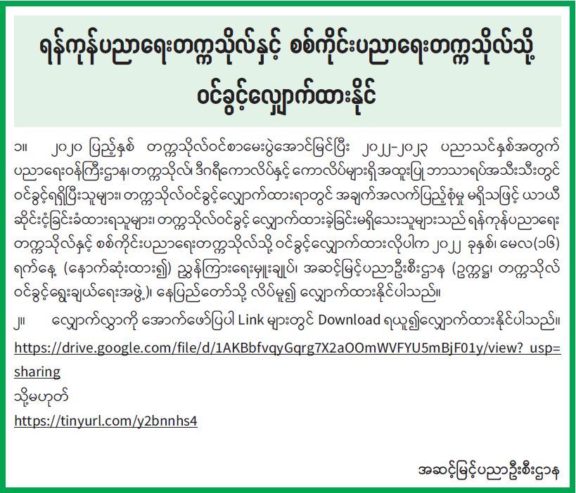 ရန်ကုန်ပညာရေးတက္ကသိုလ်နှင့် စစ်ကိုင်းပညာရေးတက္ကသိုလ်သို့ ဝင်ခွင့်လျှောက်ထားနိုင်