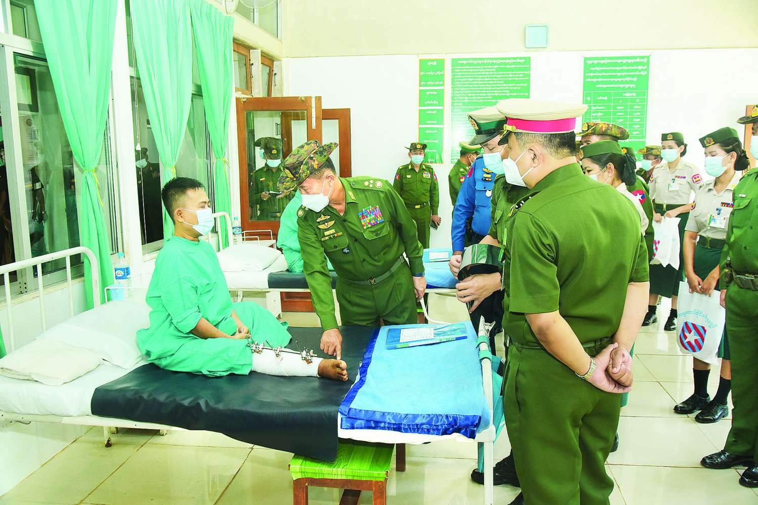 ဦးစွာ နိုင်ငံတော်စီမံအုပ်ချုပ်ရေးကောင်စီ ဒုတိယဥက္ကဋ္ဌ ဒုတိယတပ်မတော်ကာကွယ်ရေးဦးစီးချုပ် ကာကွယ်ရေးဦးစီးချုပ် (ကြည်း)နှင့် အဖွဲ့ဝင်များအား ဆေးရုံတပ်မှူးနှင့် တာဝန်ရှိသူများက ကြိုဆိုနှုတ်ဆက်ကြသည်။ ထို့နောက် ဆေးရုံတွင် တက်ရောက် ဆေးကုသမှုခံယူလျက်ရှိသည့် အရာရှိ၊ စစ်သည်၊ မိသားစုများနှင့် ဒေသခံပြည်သူများအား လိုက်လံကြည့်ရှု၍ တစ်ဦးချင်း၏ ရောဂါအခြေအနေများကို မေးမြန်းအားပေးစကား ပြောကြားကာ စားသောက်ဖွယ်ရာများနှင့် ထောက်ပံ့ပစ္စည်းများ ပေးအပ်သည်။