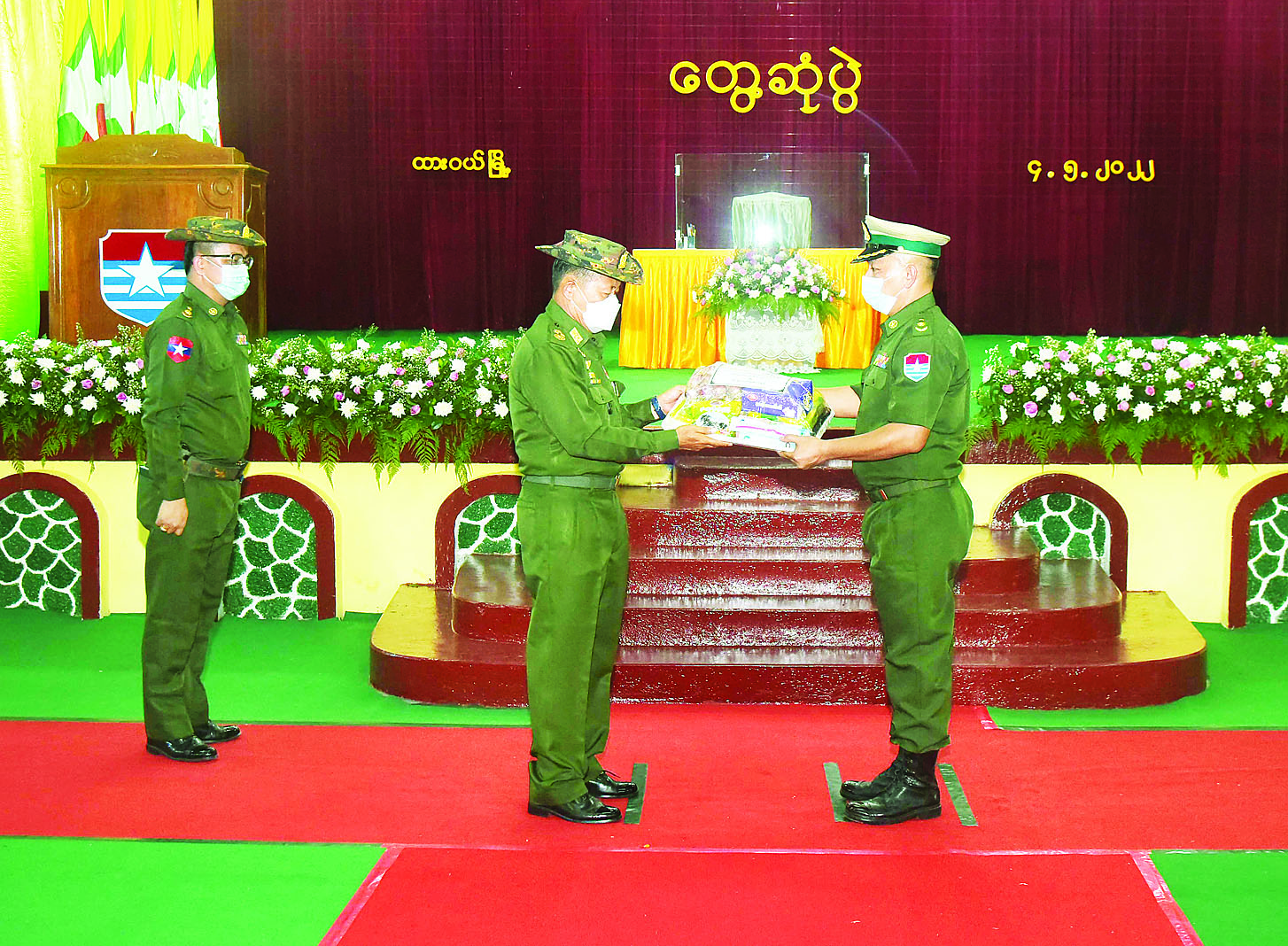 ထို့နောက် နိုင်ငံတော်စီမံအုပ်ချုပ်ရေးကောင်စီ ဒုတိယဥက္ကဋ္ဌ ဒုတိယတပ်မတော် ကာကွယ်ရေး ဦးစီးချုပ် ကာကွယ်ရေးဦးစီးချုပ် (ကြည်း)သည် အရာရှိ၊ စစ်သည်၊ မိသားစုများအတွက် စားသောက်ဖွယ်ရာပစ္စည်းများပေးအပ်ရာ တာဝန်ရှိသူတို့က လက်ခံရယူ ကြသည်။