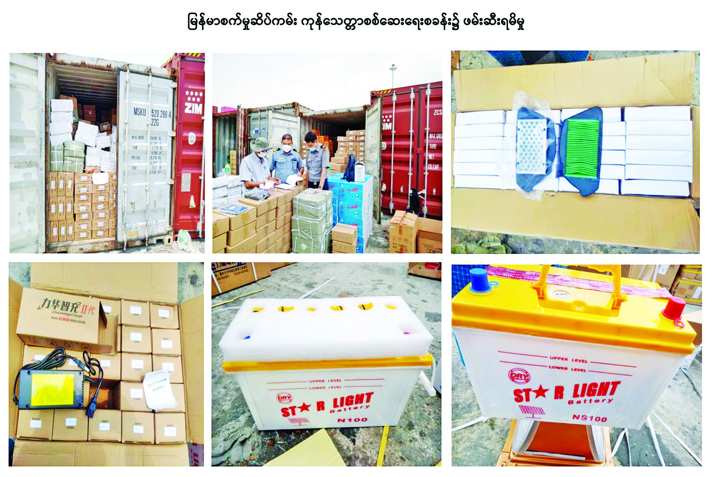 ယင်းအပြင် မေ ၆ ရက်တွင် အကောက်ခွန်ဦးစီးဌာန၏ စီမံခန့်ခွဲမှုဖြင့် မြန်မာစက်မှုဆိပ်ကမ်း ကုန်သေတ္တာစစ်ဆေးရေးစခန်း၌ တာဝန်ကျ အကောက်ခွန်အဖွဲ့က စစ်ဆေးမှုများ ဆောင်ရွက်ခဲ့ရာ သွင်းကုန်ကြေညာလွှာ (ID)တွင် ကြေညာထားခြင်းမရှိသော ဘက်ထရီအိုးနှင့် ဆက်စပ်ပစ္စည်းများ၊ အထည်အလိပ်များ၊ လူသုံးကုန်ပစ္စည်းများနှင့် အလှကုန်ပစ္စည်းများ (ခန့်မှန်းတန်ဖိုးငွေကျပ် ၁၂၅,၂၃၂,၀၀၀)ကို ဖမ်းဆီးရမိခဲ့ပြီး အကောက်ခွန် လုပ်ထုံးလုပ်နည်းနှင့်အညီ အရေးယူ ဆောင်ရွက်လျက်ရှိသည်။