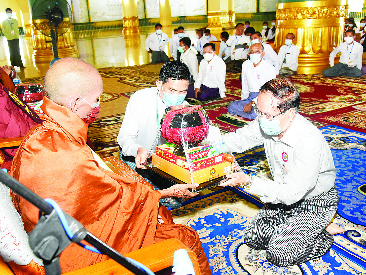 ထို့နောက် သံဃာတော်အရှင်သူမြတ်တို့ထံမှ ရွတ်ပွားသရဇ္ဈာယ်တော်မူသော မေတ္တသုတ်ပရိတ် တရားတော်များကို နာယူကြည်ညိုကြပြီး သံဃာတော်အရှင်သူမြတ်တို့အား လှူဖွယ်ပစ္စည်းများကို သာသနာရေးနှင့်ယဉ်ကျေးမှုဝန်ကြီးဌာန ပြည်ထောင်စုဝန်ကြီး(ဝဲပုံ)၊ ဒုတိယဝန်ကြီးများနှင့် တာဝန်ရှိသူများက ဆက်ကပ်လှူဒါန်းကြသည်။