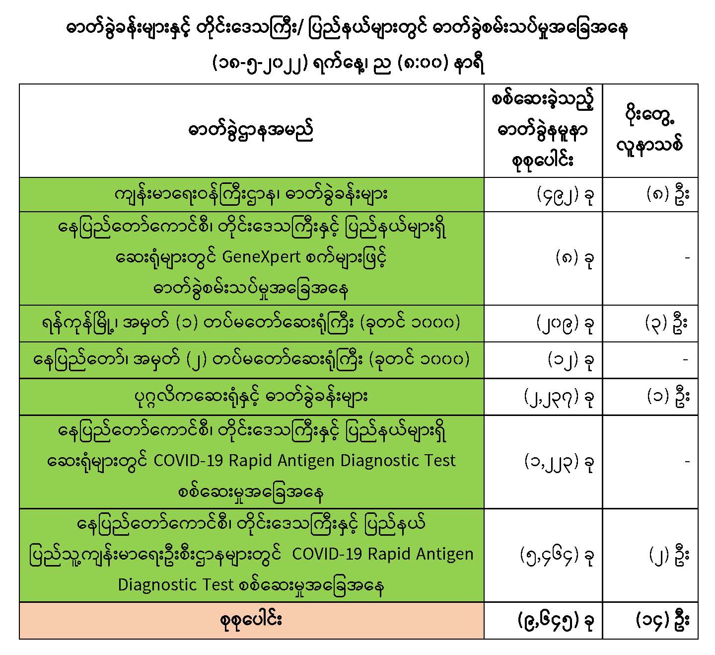 သို့ဖြစ်ပါ၍ ယနေ့အထိ ဓာတ်ခွဲနမူနာစုစုပေါင်း (8,၁၁0,2၁၃) ခုအားစစ်ဆေးခဲ့ပြီး COVID-19 ဓာတ်ခွဲအတည်ပြုလူနာ စုစုပေါင်း (613,1၈၂) ဦး ရှိပြီ ဖြစ်ပါသည်။