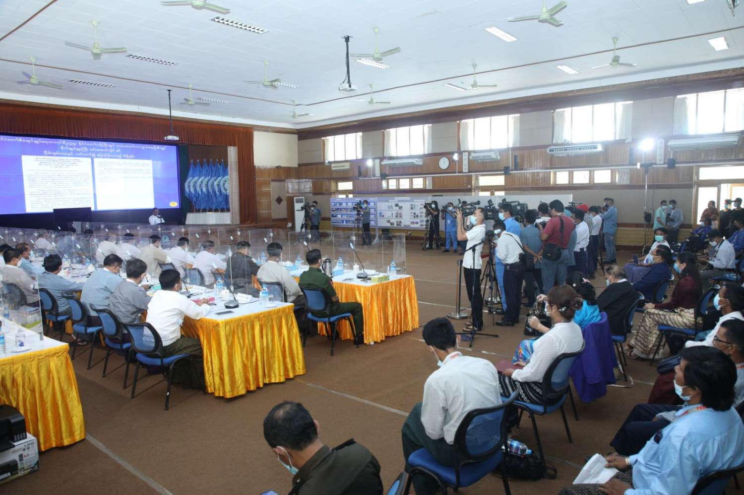 သတင်းစာရှင်းလင်းပွဲမစတင်မီ တက်ရောက်လာကြသူများအား တာဝန်ရှိသူများက ကိုဗစ်-၁၉ ရောဂါကြိုတင်ကာကွယ်ရေး အတွက် လိုအပ်သည့် ကျန်းမာရေးဆိုင်ရာစစ်ဆေးမှုများ ဆောင်ရွက်ပေးပြီး သတ်မှတ်အကွာအဝေးအတိုင်း နေရာချထာပေးသည်။