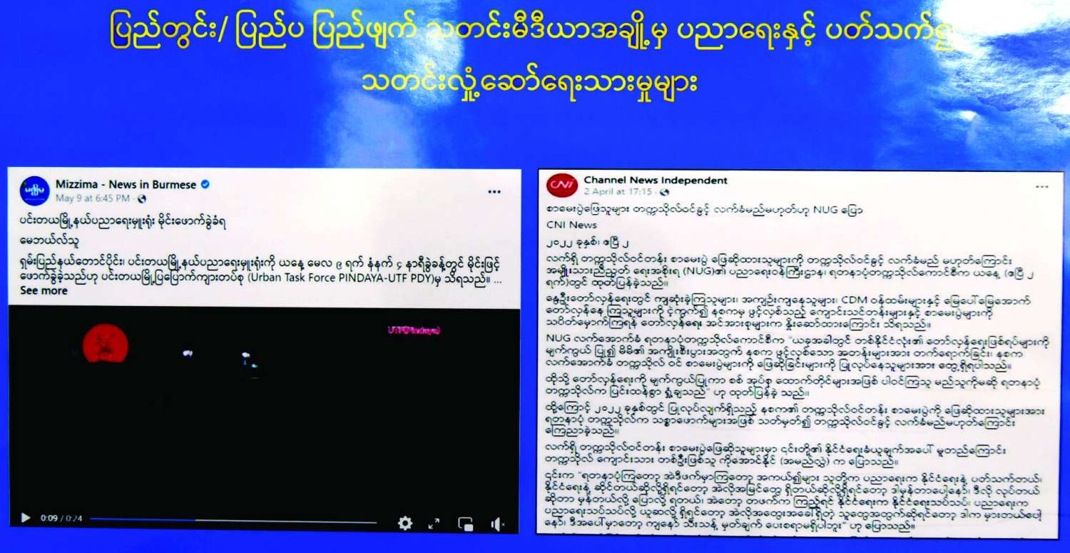 ယခုကဲ့သို့ ကျောင်းများဖွင့်လှစ်မှုနှင့် ပတ်သက်ပြီး NUG နှင့် PDF အမည်ခံအကြမ်းဖက် သမားများနှင့် ပြည်ဖျက်မီဒီယာများက ကျောင်းများမဖွင့်အောင် ခြိမ်းခြောက်နှောင့်ယှက်နေ သည်ကိုလည်း တွေ့နိုင်မည်ဖြစ်ပါကြောင်း၊ ပြီးခဲ့သည့် ပညာသင်နှစ်များတွင် အကြမ်းဖက် သမားများ၏ နှောင့်ယှက်ဖျက်ဆီးမှုကြောင့် မိုင်းထောင်၊ မိုင်းခွဲ၊ မီးရှို့၊ ဖျက်ဆီးခံခဲ့ရသည့်ကျောင်းပေါင်း ၅၀၄ ကျောင်းရှိခဲ့ပြီး ဆရာ/ ဆရာမ ၃၇ ဦးသေဆုံးခဲ့ရပါကြောင်း၊ ယခုလည်း ကျောင်းများ မဖွင့်ခင်ကတည်းက ခြိမ်းခြောက်မှုများ စတင်လုပ်ဆောင်နေသည်ကို တွေ့ရမည်ဖြစ်ပါ ကြောင်း၊ ပြည်ဖျက်မီဒီယာများကလည်း ဖော်ပြနေသည်ကိုတွေ့ရမည် ဖြစ်ကြောင်း၊ ဥပမာ - ပင်းတယ မြို့နယ်ပညာရေးမှူးရုံးကို မိုင်းထောင်ဖောက်ခွဲသည်ဆိုပြီး မီဒီယာတစ်ခုက ဖော်ပြထားကြောင်း၊ မေ ၉ ရက် နံနက်ပိုင်းတွင် လုပ်ဆောင်ခဲ့ကြောင်း၊ ယင်းသည် ကျောင်းဖွင့်တော့ မည်ဖြစ်၍ ဖောက်ခွဲခြင်းဖြစ်ပြီး နောင်တွင် ယခုထက်အားပြင်းသည့် ဗုံးနှင့်ဖောက်ခွဲမည်ဆိုသည့် ခြိမ်းခြောက်မှုမျိုးတွေ့ရပါကြောင်း၊ တစ်ဖက်တွင်လည်း “စာမေးပွဲ ဖြေဆိုသူများကို တက္ကသိုလ်ဝင်ခွင့် လက်ခံမည်မဟုတ်ဟု NUG ပြော” ဆိုပြီး ရေးထားသည်ကိုလည်း တွေ့ရမည်ဖြစ်ကြောင်း၊ အဆိုးဆုံးမှာ စာသင်ကျောင်းများကို မိုင်း ထောင်၊ ဘန်ကာဆောက်ပြီး အကြမ်းဖက်အဖွဲ့ အခြေချစခန်းများအဖြစ် အသုံးပြုနေခြင်းသာဖြစ်ကြောင်း ပြောကြားပြီး PDF အမည်ခံအကြမ်း ဖက်အဖွဲ့များက ကျောင်းကိုပိတ်ပြီး ကျောင်းထဲသို့ ဝင်ရောက်နေရာ ယူကာ အခြေချစခန်းအဖြစ်ပြုလုပ်ပြီး အကြမ်းဖက်လုပ်ရပ်များ ဆောင်ရွက်နေသည့် ဗီဒီယိုဖိုင်ကိုပြသ သည်။