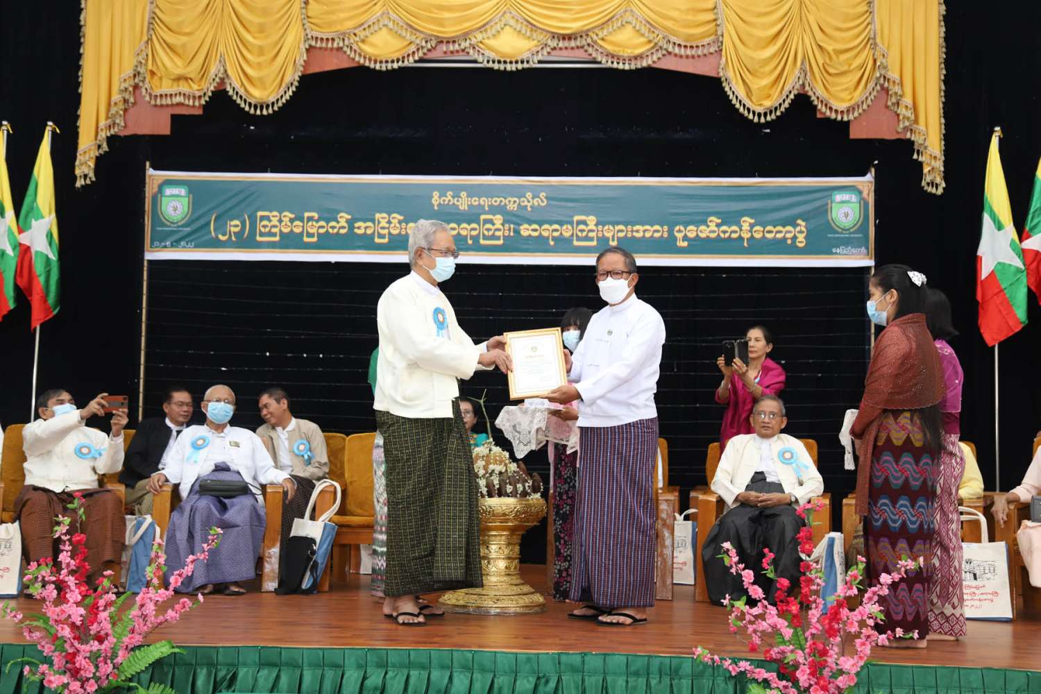 ဆက်လက်၍ အငြိမ်းစားဆရာကြီး၊ဆရာမကြီးများအတွက် ကန်တော့ငွေနှင့် ကျန်းမာရေးစောင့်ရှောက်မှုငွေပဒေသာပင်များကို ပြည်ထောင်စုဝန်ကြီးနှင့်တာဝန်ရှိသူများက ပေးအပ်ကြသည်။