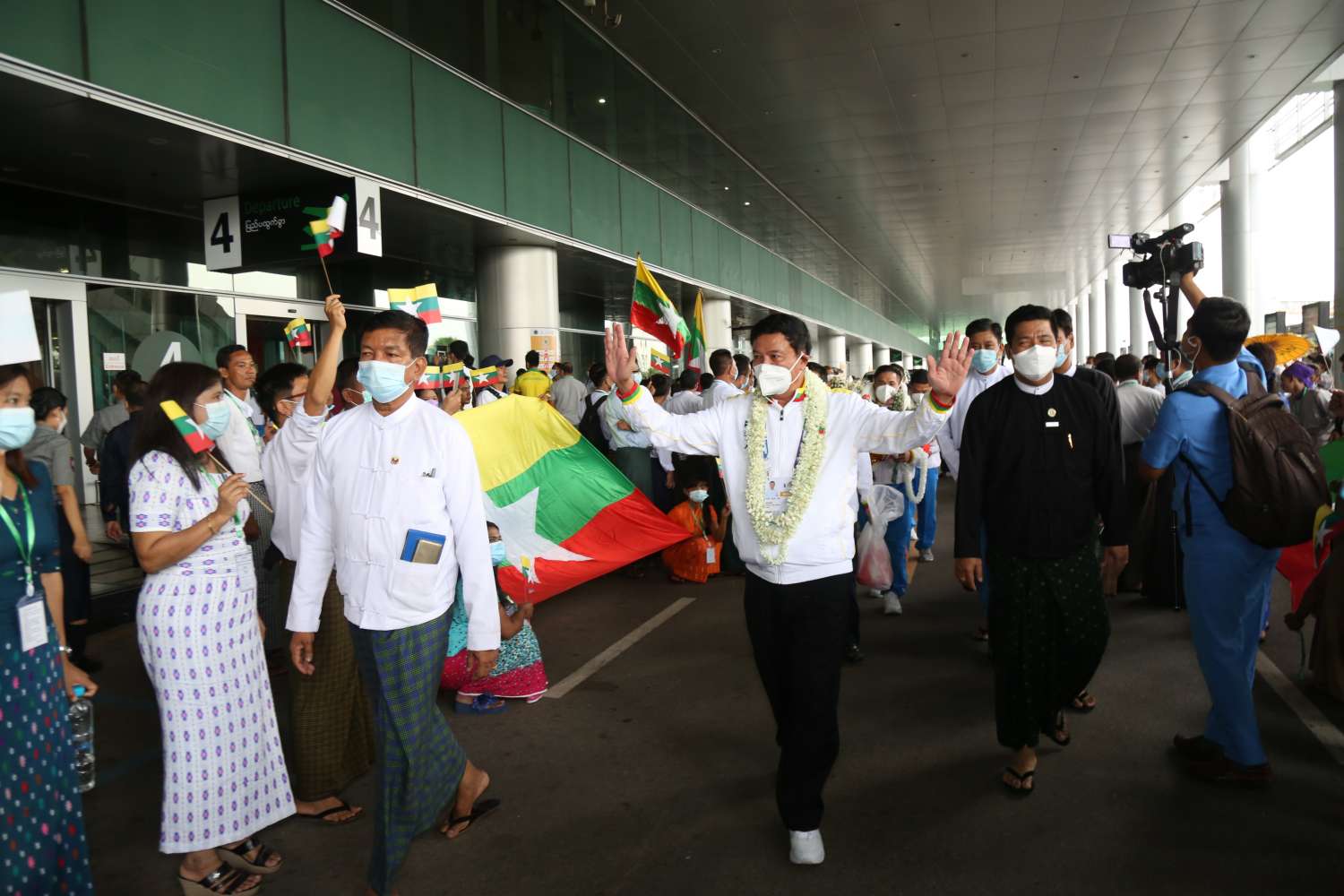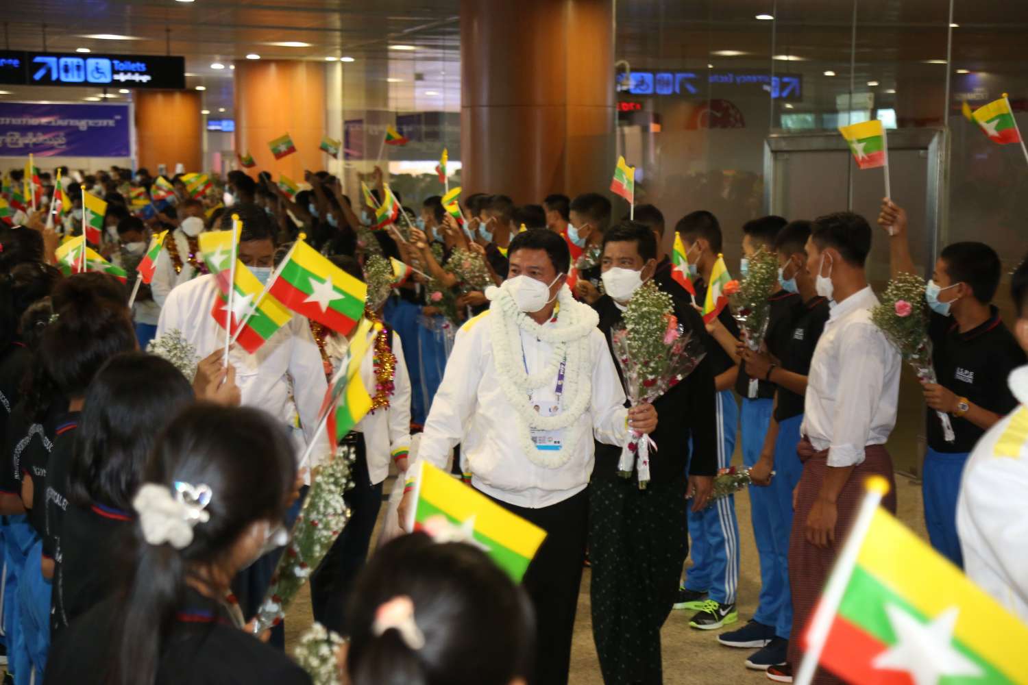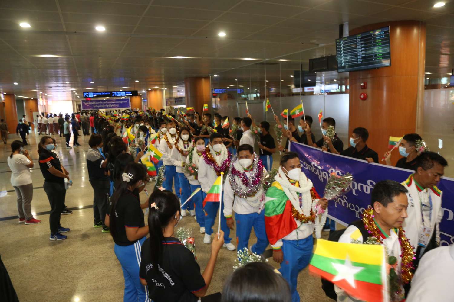 ဗီယက်နမ်နိုင်ငံ၊ ဟနွိုင်းမြို့နှင့် အခြားဆက်စပ်မြို့များတွင် မေ (၁၂)ရက်မှ (၂၃)ရက်အထိ ကျင်းပပြုလုပ်နေသည့် (၃၁)ကြိမ်မြောက် အရှေ့တောင်အာရှ အားကစားပြိုင်ပွဲတွင် ဝင်ရောက်ယှဉ်ပြိုင်ခဲ့သော မြန်မာအားကစားသမားအဖွဲ့သည် ယနေ့ညနေ ၄ နာရီတွင် ရန်ကုန်အပြည်ပြည်ဆိုင်ရာလေဆိပ်သို့ မြန်မာ့လေကြောင်း စင်းလုံးငှားလေယာဉ်ဖြင့် ပြန်လည်ရောက်ရှိလာရာ ရန်ကုန်တိုင်းဒေသကြီး အစိုးရအဖွဲ့ဝန်ကြီးချုပ် ဦးစိုးသိန်း၊ ရန်ကုန်တိုင်းဒေသကြီး စစ်ဌာနချုပ်တိုင်းမှူး ဗိုလ်ချုပ် ညွန့်ဝင်းဆွေ၊ ရန်ကုန်တိုင်းဒေသကြီး အစိုးရအဖွဲ့ဝင်ဝန်ကြီးများ၊ အားကစားနှင့်လူငယ်ရေးရာဝန်ကြီးဌာနမှ တာဝန်ရှိပုဂ္ဂိုလ်များ၊ မြန်မာနိုင်ငံ အားကစားအဖွဲ့ချုပ်များမှ ဥက္ကဋ္ဌများ၊ အနုပညာရှင်များ၊ ပြိုင်ပွဲဝင် အားကစားသမားများ၏ မိဘဆွေမျိုးများ၊ ဆရာ/ ဆရာမများနှင့် ကျောင်းသား/ ကျောင်းသူများ၊ မိဘပြည်သူများက အိုးစည်၊ ဒိုးပတ်များ၊ ပန်းစည်းများဖြင့် သောင်းသောင်းဖျဖျ ဂုဏ်ပြုကြိုဆိုကြသည်။