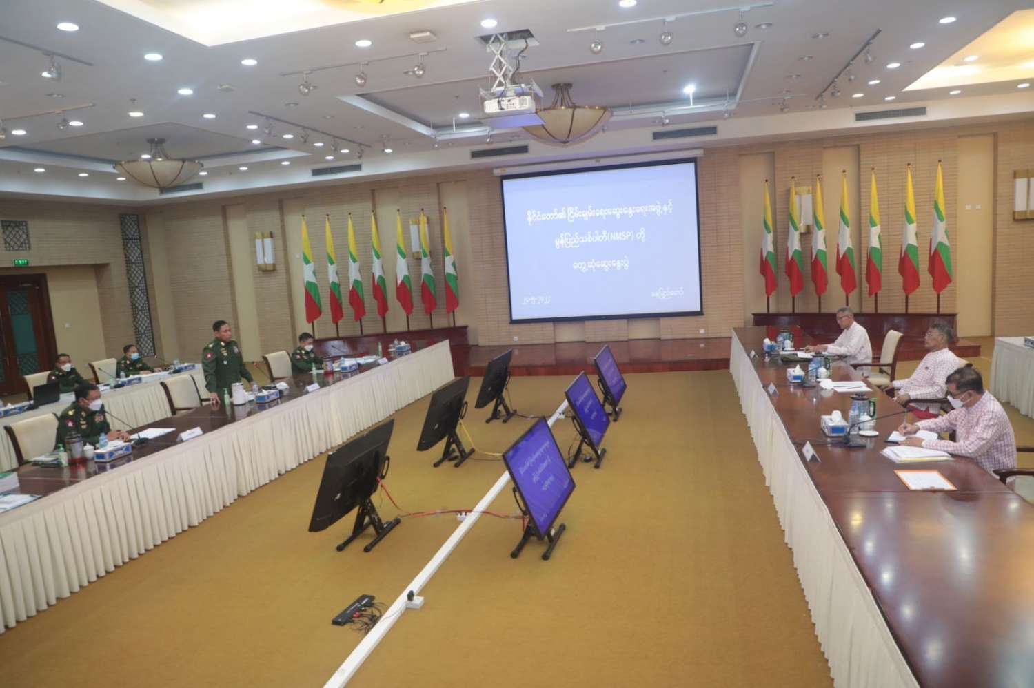 နိုင်ငံတော်၏ငြိမ်းချမ်းရေးဆွေးနွေးရေးအဖွဲ့နှင့် မွန်ပြည်သစ်ပါတီ(NMSP) ဒုတိယဥက္ကဋ္ဌ ဦးဆောင်သော ကိုယ်စားလှယ်အဖွဲ့တို့ တွေ့ဆုံဆွေးနွေးပွဲကို ယနေ့နံနက်ပိုင်းတွင် နေပြည်တော်ရှိ အမျိုးသားစည်းလုံးညီညွတ်ရေးနှင့် ငြိမ်းချမ်းရေးဖော်ဆောင်မှုဗဟိုဌာန အစည်းအဝေးခန်းမ၌ ကျင်းပသည်။