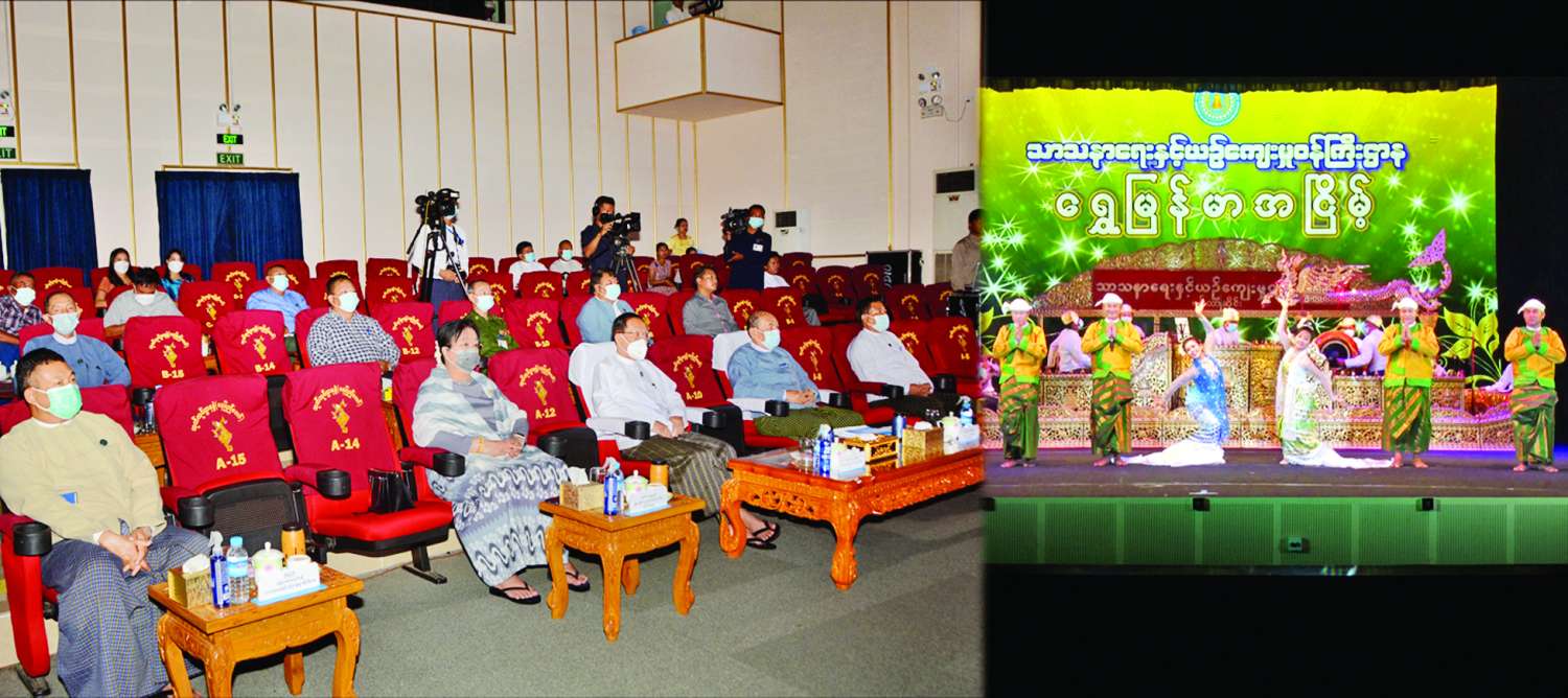 သာသနာရေးနှင့်ယဉ်ကျေးမှုဝန်ကြီးဌာန ပြည်ထောင်စုဝန်ကြီး ဦးကိုကိုသည် ပြည်ထောင်စုအစိုးရအဖွဲ့ရုံးဝန်ကြီးဌာန(၂) ပြည်ထောင်စုဝန်ကြီး ဦးချစ်နိုင်၊ မြန်မာနိုင်ငံ အမျိုးသားလူ့အခွင့်အရေးကော်မရှင်ဒုတိယဥက္ကဋ္ဌ ဒေါက်တာနန္ဒာမွှန်း၊ သာသနာရေးနှင့်ယဉ်ကျေးမှုဝန်ကြီးဌာန ဒုတိယဝန်ကြီး ဦးအေးထွန်း၊ အမြဲတမ်းအတွင်းဝန်၊ ညွှန်ကြားရေးမှူးချုပ်များ၊ အမှတ် (၂) တပ်မတော်- ရုပ်မြင်သံကြား ထုတ်လုပ်ရေးတပ်မှတပ်မှူးနှင့် အရာရှိများ၊ ဒုတိယအမြဲတမ်းအတွင်းဝန်နှင့် ဒုတိယညွှန်ကြားရေးမှူးချုပ်များ၊ ဌာနဆိုင်ရာတာဝန်ရှိသူများနှင့်အတူ ယနေ့နံနက် ၁၀ နာရီက နေပြည်တော်ရုံးအမှတ် (၃၅)ရှိ လေ့ကျင့်ရေးဇာတ်ရုံတွင် ဝတ်စုံပြည့်လေ့ကျင့်ဇာတ်တိုက်လျက်ရှိသော ရွှေမြန်မာအငြိမ့်-၃၏ တင်ဆက်မှုများကို ကြည့်ရှုစစ်ဆေးအားပေးသည်။