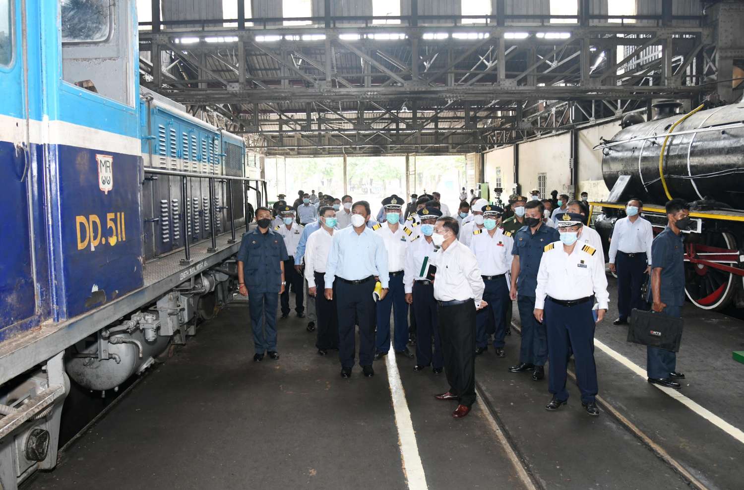ယင်းနောက် နိုင်ငံတော်စီမံအုပ်ချုပ်ရေးကောင်စီဥက္ကဋ္ဌ နိုင်ငံတော်ဝန်ကြီးချုပ်နှင့်အဖွဲ့ဝင်များသည် မီးရထားစက်ခေါင်းစက်ရုံအတွင်း မီးရထားစက်ခေါင်းများထုတ်လုပ် တပ်ဆင်နေမှု၊ ပြုပြင်ထိန်းသိမ်းနေမှု၊ စက်ခေါင်းစွမ်းအားမြှင့်တင်နေမှု၊ ရေနွေးငွေ့စက်ခေါင်းအား ကျောက်မီးသွေးသုံးစက်ခေါင်းအဖြစ်ပြုပြင်နေမှု၊ မီးရထားစက်ခေါင်းအရံပစ္စည်းများ ထုတ်လုပ် ထားရှိမှုအခြေအနေများကို လှည့်လည်ကြည့်ရှုစစ်ဆေးရာ တာဝန်ရှိသူများက လိုက်လံရှင်းလင်းတင်ပြကြသည်။