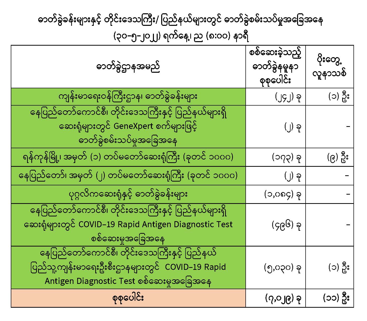 သို့ဖြစ်ပါ၍ ယနေ့အထိ ဓာတ်ခွဲနမူနာစုစုပေါင်း (၈,၁၉၈,၀၅၈) ခုအားစစ်ဆေးခဲ့ပြီး COVID-19 ဓာတ်ခွဲအတည်ပြုလူနာ စုစုပေါင်း (၆၁၃,၃၂၆) ဦး ရှိပြီ ဖြစ်ပါသည်။