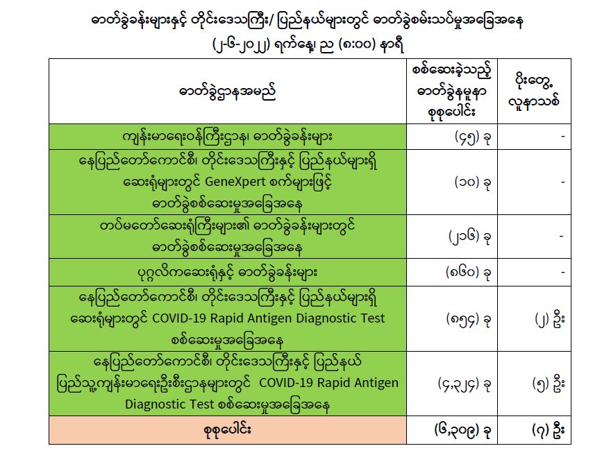 သို့ဖြစ်ပါ၍ ယနေ့အထိ ဓာတ်ခွဲနမူနာစုစုပေါင်း (၈,၂၁၉,၀၂၈) ခုအားစစ်ဆေးခဲ့ပြီး COVID-19 ဓာတ်ခွဲအတည်ပြုလူနာ စုစုပေါင်း (၆၁၃,၃၅၅) ဦး ရှိပြီ ဖြစ်ပါသည်။