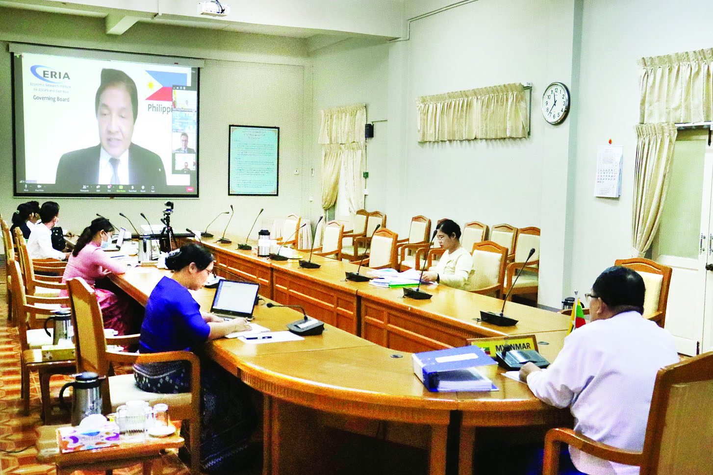 (၁၅) ကြိမ်မြောက် အာဆီယံနှင့်အရှေ့အာရှစီးပွားရေးသုတေသနဌာန (ERIA) အုပ်ချုပ်မှုဘုတ်အဖွဲ့အစည်းအဝေးကို ယနေ့နံနက် ၁၁ နာရီခွဲတွင်ကျင်းပရာ မြန်မာနိုင်ငံ၏ အီးအာရ်အိုင်အေအုပ်ချုပ်မှုဘုတ်အဖွဲ့ဝင်၊ ရင်းနှီးမြှုပ်နှံမှုနှင့်နိုင်ငံခြားစီးပွားဆက်သွယ်ရေးဝန်ကြီးဌာန ဒုတိယဝန်ကြီးဦးသန်းအောင်ကျော်သည် ရင်းနှီးမြှုပ်နှံမှုနှင့်နိုင်ငံခြားစီးပွားဆက်သွယ်ရေးဝန်ကြီးဌာန ရုံးအမှတ် (၁) မှ ဗီဒီယိုကွန်ဖရင့်စနစ်ဖြင့် တက်ရောက်သည်။