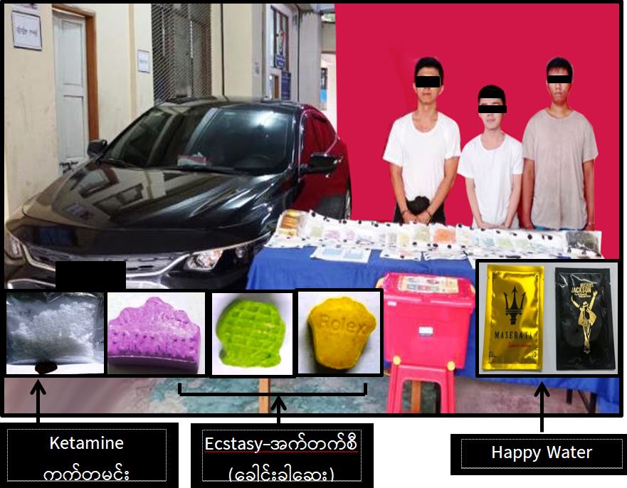 ဖြစ်စဉ်မှာ မူးယစ်ဆေးဝါး တားဆီးနှိမ်နင်းရေးရဲတပ်ဖွဲ့မှ တပ်ဖွဲ့ဝင်များပါဝင်သော ပူးပေါင်း အဖွဲ့သည် မေ ၂၅ ရက် မွန်းလွဲ ၂ နာရီခွဲတွင် ရန်ကုန်တိုင်းဒေသကြီး၊ ဗဟန်းမြို့နယ်၊ ဆရာစံရပ်ကွက်ရှိ ဟိုတယ်အခန်းအမှတ်(၅၀၉)ကို သတင်းအရရှာဖွေရာ နိုင်လွင်နှင့် ဟိန်းသူစိုး(ခ) Shake တို့ ၂ ဦးအား Ecstasy-အက်တက်စီ(ခေါင်းခါဆေး)ဆေးပြား ၅၀ ၊ Ketamine-ကက်တမင်း ၃ ဂရမ်နှင့်အတူ ဖမ်းဆီးရမိခဲ့ပြီး စစ်ဆေးချက်အရ ည ၇ နာရီတွင် စိတ်ပြောင်းဆေးဝါးများ ဖြန့်ဖြူးရောင်းချသူ ထက်အောင်ဝေ(ခ)Jason ကို ရန်ကင်းမြို့နယ်၊ အမှတ်(၅)ရပ်ကွက်ရှိ ဟိုတယ်ကားပါကင်၌ Chevrolet မော်တော်ယာဉ်နှင့်အတူ Ecstasy-အက်တက်စီ(ခေါင်းခါဆေး)ဆေးပြား ၄,၀၀၀ ၊ Ketamine-ကက်တမင်း ဂရမ် ၁၇၀ ၊ Happy Water (စိတ်ပြောင်းဆေးဝါးများ ရောစပ်ထားသောအမှုန့်) ၇ ဂရမ်စီပါ အထုပ် ၇၀ နှင့်အတူ ဆက်လက်ဖမ်းဆီးရမိခဲ့ကြောင်း၊ သတင်းကွင်းဆက်အရ မေ ၂၆ ရက် နံနက် ၇ နာရီတွင် ကရင်ပြည်နယ်၊ မြဝတီမြို့၊ အမှတ်(၄)ရပ်ကွက်ရှိ စားသောက်ဆိုင် ပိုင်ရှင် ကောင်းစစ်(ခ) ကိုစစ် ကို Ketamine-ကက်တမင်း သုည ဒသမ ၂ ဂရမ်၊ Ecstasy-အက်တက်စီ (ခေါင်းခါဆေး) ဆေးပြား ၁ ပြား၊ Happy Water (စိတ်ပြောင်းဆေးဝါးများရောစပ်ထားသော အမှုန့်) ၁၅ ဂရမ်တို့နှင့်အတူ ဖမ်းဆီးရမိခဲ့သဖြင့် စုစုပေါင်း ဒေသကာလတန်ဖိုးတန်ဖိုး ငွေကျပ်သိန်း ၁,၇၀၀ ကျော် တန်ဖိုးရှိ Ecstasy-အက်တက်စီ(ခေါင်းခါဆေး)ဆေးပြား ၄,၀၅၁ ပြား၊ Ketamine-ကက်တမင်း ၁၇၃ ဒသမ ၂ ဂရမ်၊ Happy Water (စိတ်ပြောင်း ဆေးဝါးများ ရောစပ်ထားသောအမှုန့်) ၄၉၇ ဂရမ်တို့ ဖမ်းဆီးရမိခဲ့ကြောင်း၊ စစ်ဆေး ဖော်ထုတ်ချက်အရ သိမ်းဆည်းရမိ စိတ်ပြောင်းဆေးဝါးများဖြစ်သည့် Ecstasy-အက်တက်စီ(ခေါင်းခါဆေး) ၁ ပြားလျှင် ငွေကျပ် ၆ သောင်း၊ Ketamine-ကက်တမင်း ၁ ဂရမ်လျှင် ငွေကျပ် ၆ သောင်း၊ Happy Water(စိတ်ပြောင်းဆေးဝါးများရောစပ်ထား သောအမှုန့်) ၇ ဂရမ်ပါ ၁ ထုပ်လျှင် ငွေကျပ် ၈ သောင်းနှုန်းဖြင့် KTV နှင့် Entertainment/ Bar/ Club များတွင် လာရောက်ကြသည့် လူငယ်များကို ဖြန့်ဖြူးရောင်းချခြင်းဖြစ်ကြောင်း သိရှိရသဖြင့် ၎င်းတို့အား ဥပဒေအရ အရေးယူထားရှိပြီး ကွင်းဆက်ပြစ်မှု ကျူးလွန်သူများနှင့် အလားတူ လူငယ်များအန္တရာယ် ဖြစ်စေနိုင်သည့် မူးယစ်ဆေးဝါးနှင့် စိတ်ကိုပြောင်းလဲစေသောဆေးဝါးများ ဖြန့်ဖြူးရောင်းချမှုများကို ဆက်လက်စစ်ဆေး ဖော်ထုတ်လျက်ရှိကြောင်း သိရသည်။