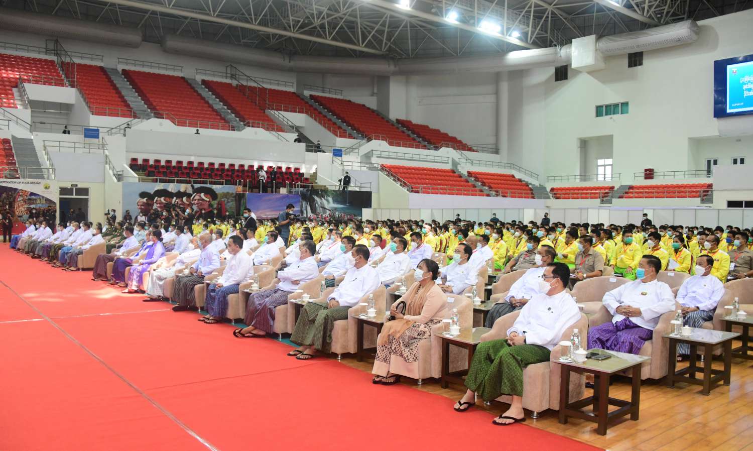 အခမ်းအနားသို့ နိုင်ငံတော်စီမံအုပ်ချုပ်ရေးကောင်စီဥက္ကဋ္ဌ နိုင်ငံတော်ဝန်ကြီးချုပ်နှင့်အတူ ကောင်စီဒုတိယဥက္ကဋ္ဌ ဒုတိယဝန်ကြီးချုပ် ဒုတိယဗိုလ်ချုပ်မှူးကြီး စိုးဝင်း၊ နိုင်ငံတော်စီမံအုပ်ချုပ်ရေးကောင်စီအဖွဲ့ဝင်များ၊ ပြည်ထောင်စုတရားသူကြီးချုပ်၊ နိုင်ငံတော် ဖွဲ့စည်းပုံ အခြေခံဥပဒေဆိုင်ရာ ခုံရုံးဥက္ကဋ္ဌ၊ ပြည်ထောင်စုဝန်ကြီးများ၊ ပြည်ထောင်စုစာရင်းစစ်ချုပ်၊ ပြည်ထောင်စုရာထူးဝန်အဖွဲ့ဥက္ကဋ္ဌ၊ နေပြည်တော်ကောင်စီဥက္ကဋ္ဌ၊ မြန်မာနိုင်ငံတော်ဗဟိုဘဏ်ဥက္ကဋ္ဌ၊ ကာကွယ်ရေးဦးစီးချုပ်ရုံးမှ တပ်မတော် အရာရှိကြီးများ၊ နေပြည်တော်တိုင်းစစ်ဌာနချုပ် တိုင်းမှူး၊ ဒုတိယဝန်ကြီးများ၊ မြန်မာနိုင်ငံ အိုလံပစ်ကောင်စီအဖွဲ့ဝင်များ၊  မြန်မာနိုင်ငံအားကစား အဖွဲ့ချုပ်များမှ ဥက္ကဋ္ဌများ၊ ဒုတိယဥက္ကဋ္ဌများ၊ ဖိတ်ကြားထားသူများ၊ နိုင်ငံ့ဂုဏ်ဆောင် အားကစားသမားများ၊ အုပ်ချုပ်သူများ၊ နည်းပြများနှင့် တာဝန်ရှိသူများ တက်ရောက်ကြသည်။