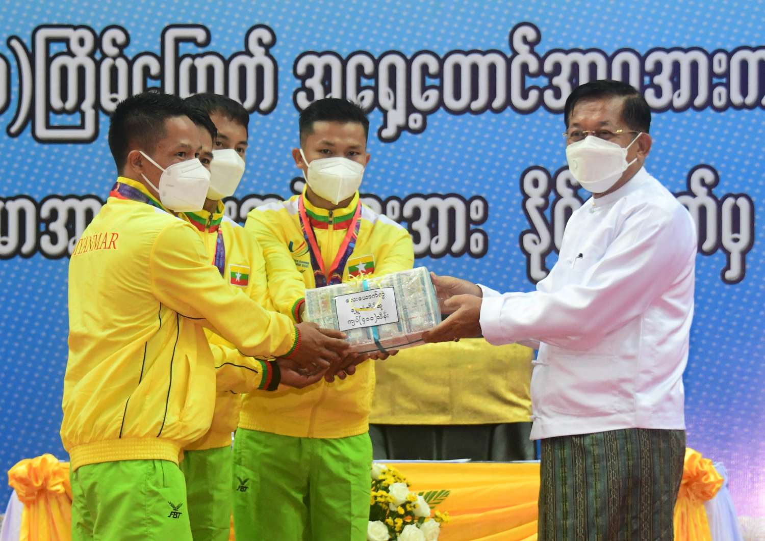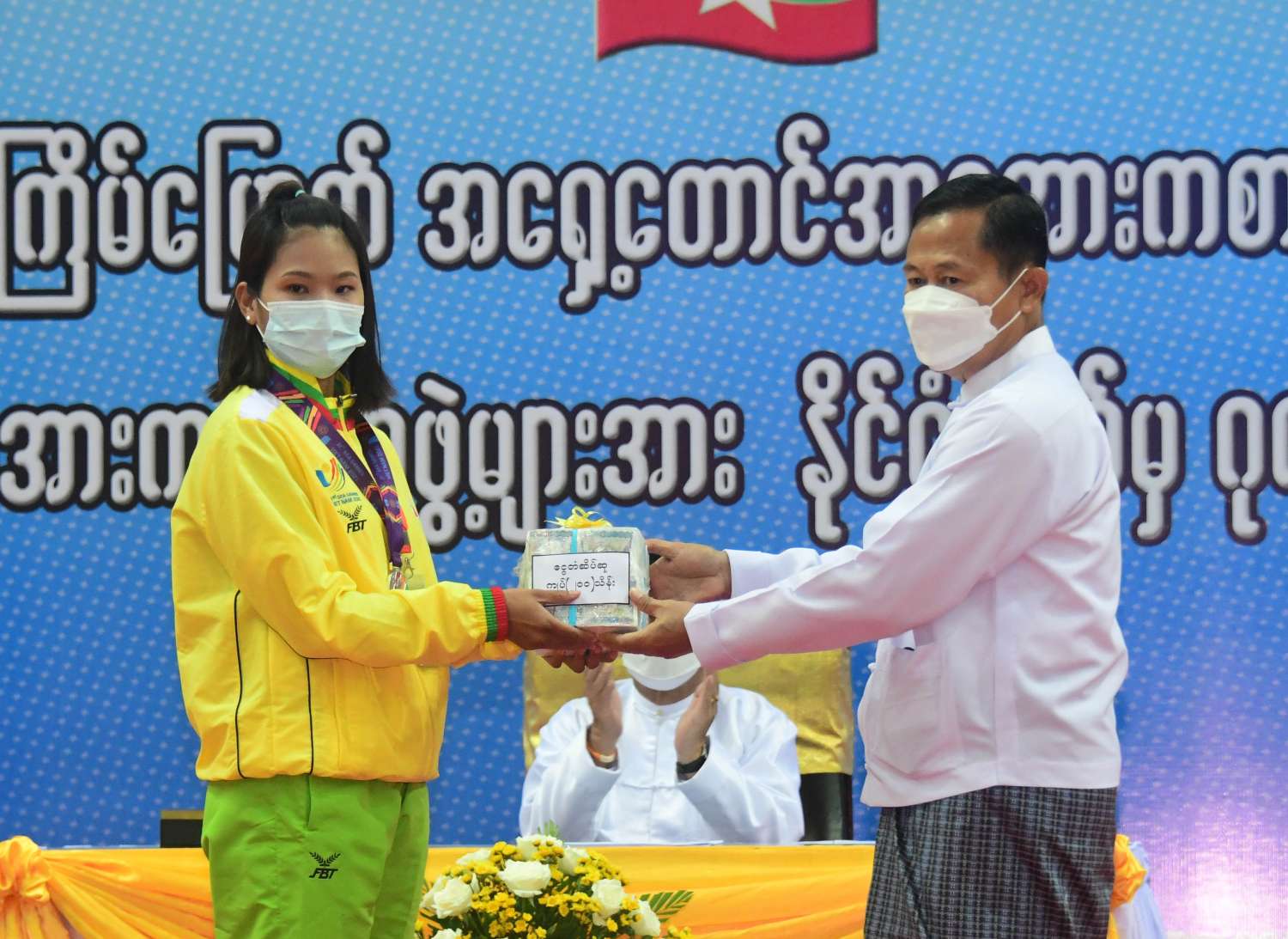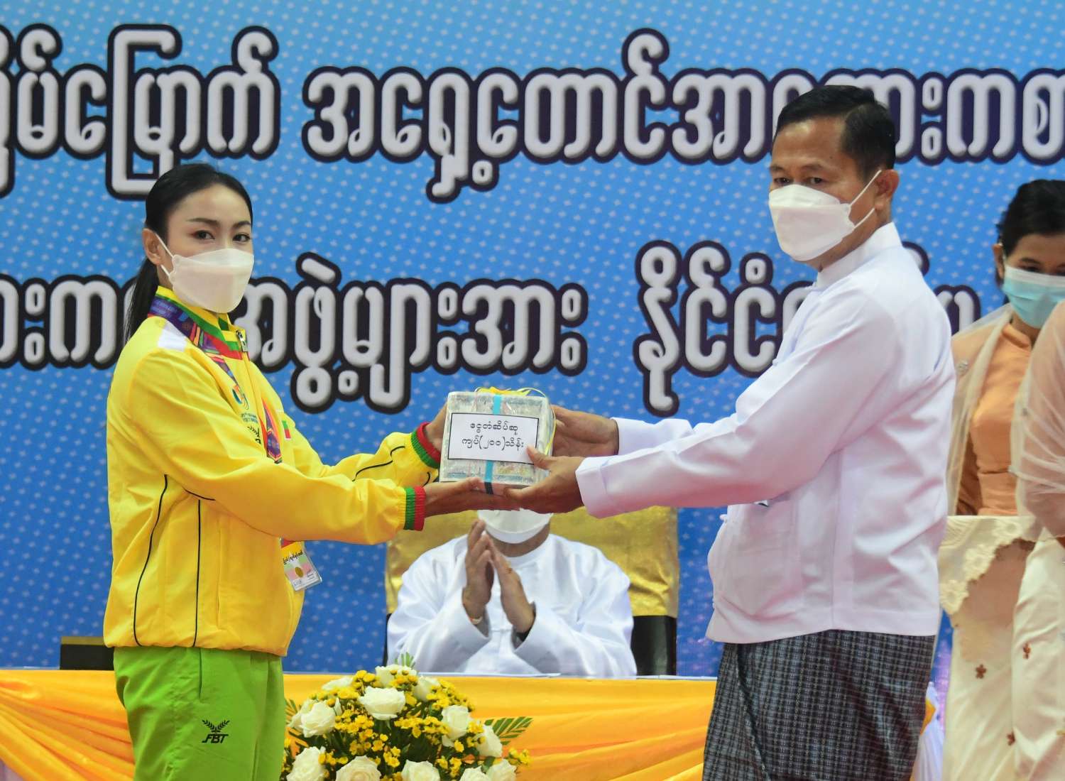 ထို့နောက် (၃၁)ကြိမ်မြောက် အရှေ့တောင်အာရှ အားကစားပြိုင်ပွဲတွင် ဆုတံဆိပ် ရရှိခဲ့သည့် နိုင်ငံ့ဂုဏ်ဆောင် ဆုရအားကစားသမားများ၊ နည်းပြများနှင့် အုပ်ချုပ်သူများကို ဂုဏ်ပြုဆုငွေများ ပေးအပ်ချီးမြှင့်ရာ နိုင်ငံတော်စီမံအုပ်ချုပ်ရေးကောင်စီဥက္ကဋ္ဌ နိုင်ငံတော်ဝန်ကြီးချုပ်က ရွှေတံဆိပ်ဆု ရရှိခဲ့ကြသည့် ဗိုဗီနမ် အားကစားနည်းမှ မောင်မနားကွီး၊ မောင်အိုက်စိုးလင်း၊ မောင်ဇင်လင်းထွန်း၊ မောင်ဇော်ဇော်၊ မောင်အောင်ခိုင်လင်း၊ မောင်ရာဇာထွန်း၊ မောင်ဟိန်းထက်အောင်၊ မောင်ကျော်သူစိုး အောင်၊ မခိုင်ဝါဖူး၊ မမေဟန်နီအောင်လွင်၊ ပိုက်ကျော်ခြင်း အားကစားနည်းမှ မခင်နှင်းဝေ၊ မဖြူဖြူသန်း၊ မယမုံဇင်၊ ဝူရှူး အားကစားနည်းမှ မောင်သိန်းသန်းဦး၊ Kurash အားကစားနည်းမှ မအေးအေးအောင်၊ ကာယဗလနှင့် ကာယကြံ့ခိုင်မှုအားကစားနည်းမှ မောင်ရဲထွန်းနောင်၊ ပီတန်း အားကစားနည်းမှ မခင်ချယ်ရီသက်၊ ဘိလိယက်နှင့် စနူကာ အားကစားနည်းမှ ဦးပေါက်စ တို့ကို ဂုဏ်ပြုချီးမြှင့်ငွေများ ပေးအပ်ချီးမြှင့်သည်။