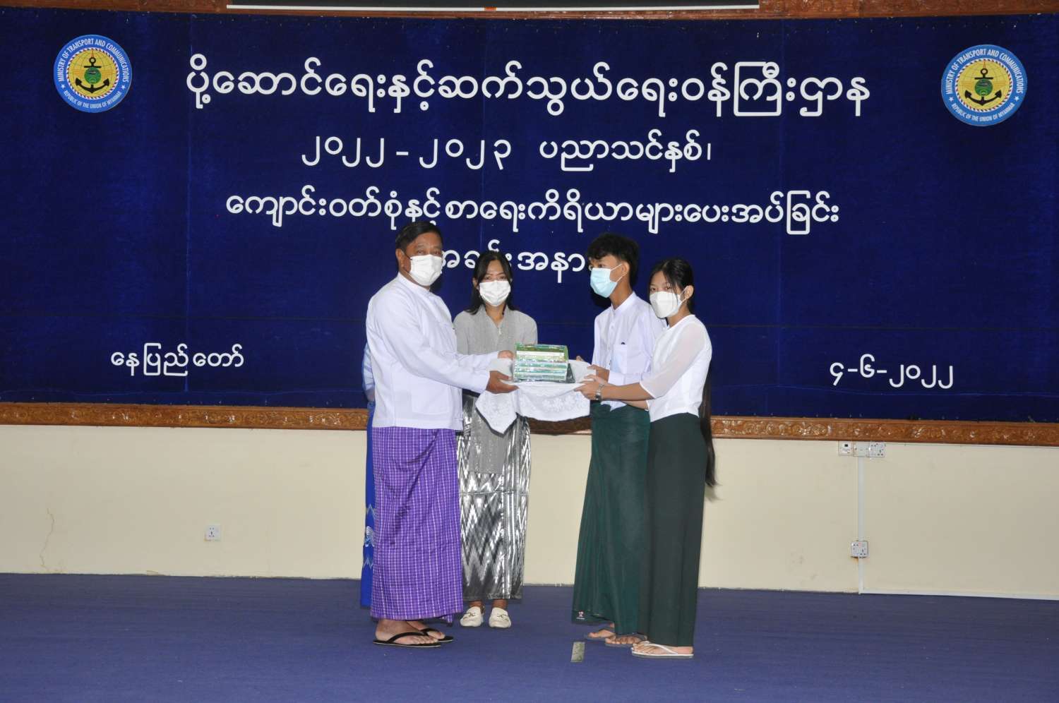 ယနေ့အခမ်းအနားတွင် ပို့ဆောင်ရေးနှင့်ဆက်သွယ်ရေးဝန်ကြီးဌာနအတွင်းရှိ ဝန်ထမ်း မိသားစုများ၏ ရင်သွေးငယ် အခြေခံပညာမူလတန်း၊ အလယ်တန်းနှင့် အထက်တန်း ကျောင်းသား/ ကျောင်းသူ ၁၄,၄၃၀ တို့အတွက် ကျောင်းစိမ်းဝတ်စုံ၊ ဗလာစာအုပ်နှင့် စာရေးကရိယာများကို ထောက်ပံ့ပေးအပ်ခဲ့ကြောင်း သိရသည်။