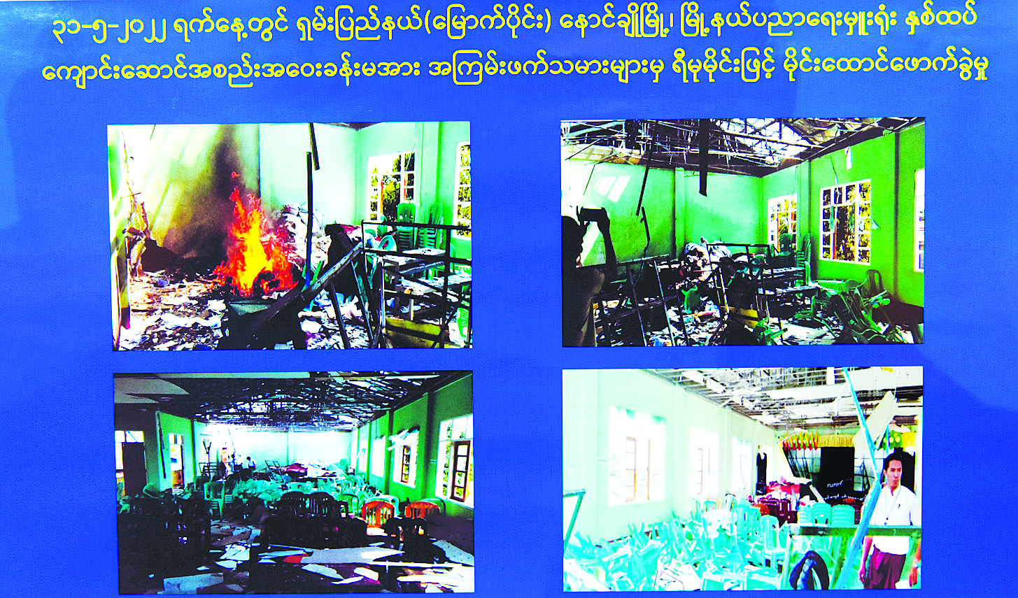 ကျောင်းဖွင့်ရန်ပြင်ဆင်ချိန်ကာလဖြစ်သည့် မေ ၁၁ ရက် ည ၁၀ နာရီတွင် စစ်ကိုင်းတိုင်းဒေသကြီး ကသာမြို့နယ် တုန်းပေါကျေးရွာ အခြေခံပညာအလယ်တန်းကျောင်း မီးရှို့ဖျက်ဆီးခံရမှု၊ မေ ၂၈ ရက် မွန်းလွဲ ၂ နာရီခွဲခန့်တွင် ထားဝယ်မြို့အမှတ်(၃) အခြေခံပညာအထက်တန်းကျောင်း လက်လုပ်မိုင်းဖြင့် ဖောက်ခွဲခံရမှု၊ မေ ၂၉ ရက် နံနက် ၁ နာရီတွင် ကလေးမြို့ အမှတ်(၈) အခြေခံပညာ အထက်တန်းကျောင်း မီးရှို့ခံရမှုဖြစ်ပြီး ကျောင်းဆောင်အားလုံး မည်သို့မျှ သုံးစွဲမှုမရသည့်ပုံကို တွေ့မြင်နိုင်မည်ဖြစ်ကြောင်း၊ မေ ၃၁ ရက် မွန်းလွဲ ၂ နာရီတွင် ရှမ်းပြည်နယ်မြောက်ပိုင်း နောင်ချိုမြို့ မြို့နယ်ပညာရေးမှူးရုံး နှစ်ထပ်ကျောင်းဆောင် အစည်းအဝေးခန်းမတွင် ပညာရေးမှူးနှင့် ကျောင်းအုပ်ဆရာ/ဆရာမများ ပညာရေးအစည်းအဝေးပြုလုပ်နေစဉ် ရီမုမိုင်းဖြင့် မိုင်းထောင်ဖောက်ခွဲမှုကြောင့် လက်ထောက်မြို့နယ်ပညာရေးမှူးအပါအဝင် ကျောင်းအုပ် ဆရာ/ ဆရာမ၊ အရပ်သားဝန်ထမ်း ခုနစ်ဦး ထိခိုက်ဒဏ်ရာရကာ တစ်ဦးသေဆုံးခဲ့သည့် ဖြစ်စဉ်များ ဖြစ်ခဲ့ပါကြောင်း၊ ထိခိုက်ဒဏ်ရာရ သေဆုံးခဲ့သည့် ပညာရေးဝန်ထမ်းနှင့်ပတ်သက်ပြီး မိမိတို့အစိုးရအနေဖြင့် မိသားစုနှင့်ထပ်တူဝမ်းနည်းရပါကြောင်း၊ ထိရောက်သည့် အရေးယူဆောင်ရွက်မှုများ ကို ဆက်လက်ဆောင်ရွက်သွားမည်ဖြစ်ကြောင်း။