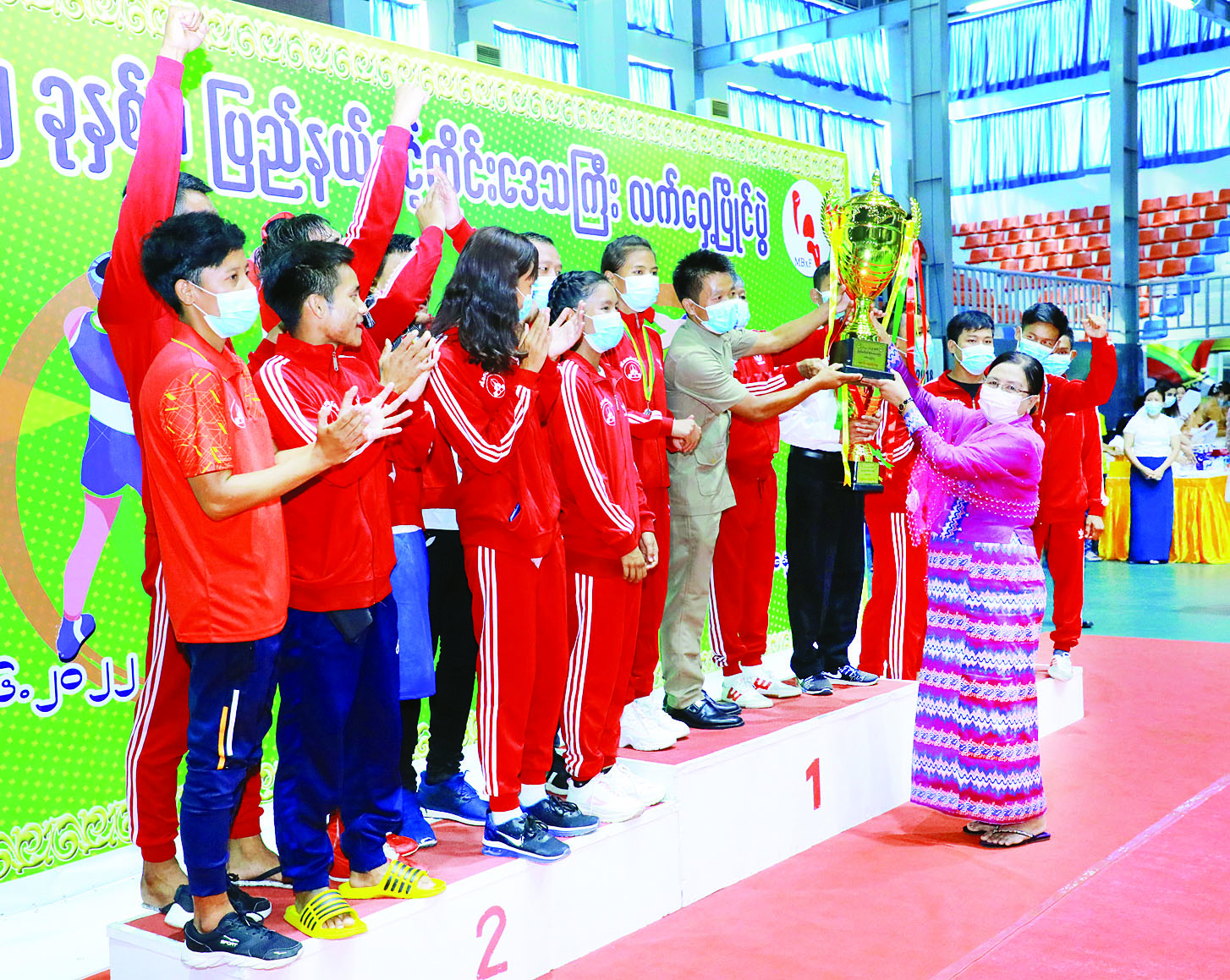 ဆက်လက်၍ အမျိုးသားအကောင်းဆုံး အားကစားသမားဆုနှင့် အမျိုးသမီးအကောင်းဆုံး အားကစားသမားဆု ရရှိသွားသည့် ရှိုင်းငယ် (ရှမ်းပြည်နယ်) နှင့် သင်းသင်းခိုင် (မကွေးတိုင်း) တို့ကို နိုင်ငံတော်စီမံအုပ်ချုပ်ရေးကောင်စီအဖွဲ့ဝင် ဦးစိုင်းလုံးဆိုင်က ဆုဖလားနှင့် ငွေသားဆု ငွေကျပ် တစ်သိန်းစီကိုလည်းကောင်း၊ ရွှေတံဆိပ်သုံးခုဖြင့် အမျိုးသမီး တံခွန်စိုက်ဒိုင်းဆု ရရှိသွားသည့် တနင်္သာရီတိုင်းဒေသကြီးအသင်းကို နိုင်ငံတော်စီမံအုပ်ချုပ်ရေးကောင်စီအဖွဲ့ဝင် ဦးမောင်းဟာ ကလည်းကောင်း၊ ရွှေတံဆိပ်ငါးခု၊ ကြေးတံဆိပ်တစ်ခုဖြင့် အမျိုးသားတံခွန်စိုက်ဒိုင်းဆု ရရှိသွားသည့် မန္တလေးတိုင်းဒေသကြီးအသင်းကို နိုင်ငံတော် စီမံအုပ်ချုပ်ရေးကောင်စီအဖွဲ့ဝင် Jeng Phang နော်တောင်ကလည်းကောင်း၊ ရွှေတံဆိပ်ငါးခု၊ ငွေတံဆိပ်တစ်ခုနှင့် ကြေးတံဆိပ်နှစ်ခုတို့ဖြင့် စုပေါင်းတံခွန်စိုက် ဒိုင်းဆုရရှိသွားသည့် မန္တလေးတိုင်းဒေသကြီး အသင်းကို နိုင်ငံတော်စီမံအုပ်ချုပ်ရေးကောင်စီအဖွဲ့ဝင် ဒေါ်အေးနုစိန်ကလည်းကောင်း တံခွန်စိုက်ဒိုင်းဆုများကို ပေးအပ်ချီးမြှင့်ခဲ့ကြောင်း သိရသည်။
