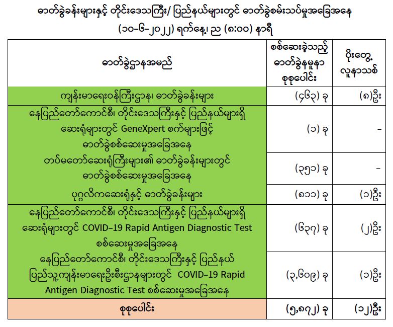 COVID-19 သံသယလူနာများ၊ ဓာတ်ခွဲအတည်ပြုလူနာနှင့် အနီးကပ်ထိတွေ့ခဲ့သူများနှင့် အသွားအလာကန့်သတ်ထားရှိသူများအား COVID-19 ရောဂါ ရှိ၊ မရှိ ဓာတ်ခွဲစမ်းသပ်စစ်ဆေးခြင်းအား ပုံမှန်ဆောင်ရွက်လျက်ရှိပြီး (၉-၆-၂၀၂၂) ရက်နေ့၊ ည (၈:၀၀) နာရီမှ (၁၀-၆-၂၀၂၂) ရက်နေ့၊ ည(၈:၀၀) နာရီအတွင်း ဓာတ်ခွဲနမူနာစုစုပေါင်း (၅,၈၇၂)ခုအား စစ်ဆေးပြီးစီးခဲ့ရာ COVID-19 ရောဂါ ဓာတ်ခွဲအတည်ပြုလူနာသစ် (၁၂)ဦး တွေ့ရှိရပါသည်။ ထို့ကြောင့် ယနေ့အတွက် ရောဂါပိုးတွေ့ရှိမှုရာခိုင်နှုန်းမှာ (၀.၂၀) ရာခိုင်နှုန်းရှိပါသည်။