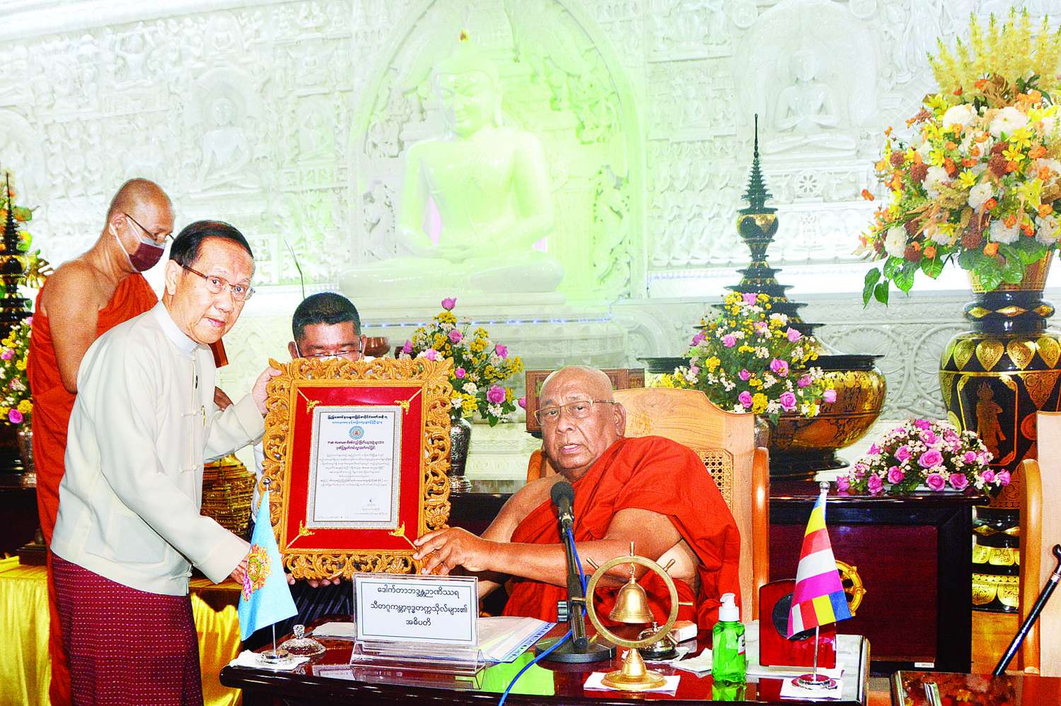 ယင်းနောက် အခမ်းအနားသို့ ကြွရောက်တော်မူလာသော ဆရာတော်ကြီးများနှင့် စိစစ်တည်းဖြတ်ရေးအဖွဲ့လေးဖွဲ့မှ ဆရာတော်ကြီးများထံ ဂုဏ်ပြုမှတ်တမ်းလွှာနှင့် လှူဖွယ်ဝတ္ထုပစ္စည်းများ ဆက်ကပ်လှူဒါန်းပြီး (အပေါ်ပုံ) သီတဂူဆရာတော်ကြီးထံမှ လှူဒါန်းမှုအစုစုအတွက် ရေစက်သွန်းလောင်း အမျှပေးဝေကာအခမ်းအနားကို ရုပ်သိမ်းခဲ့ကြောင်း သိရသည်။