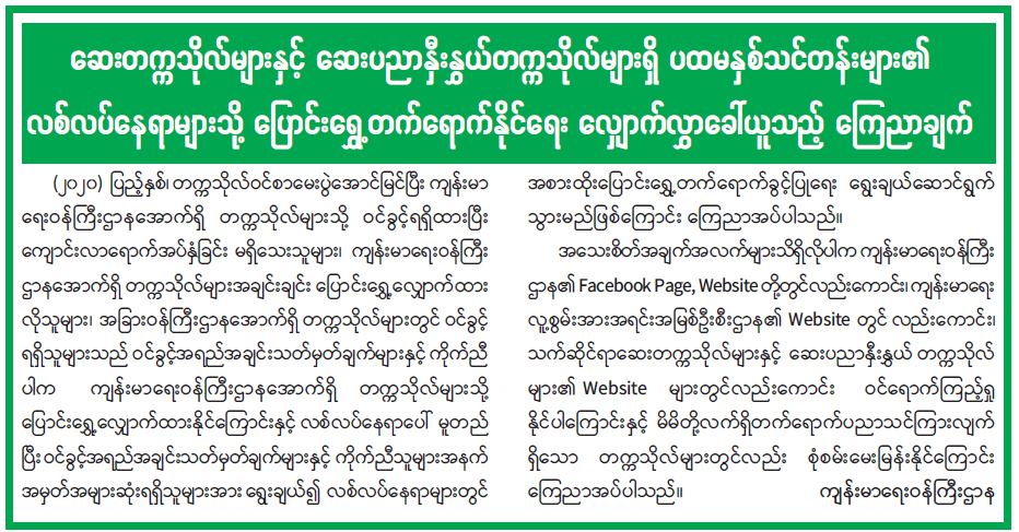 ဆေးတက္ကသိုလ်များနှင့် ဆေးပညာနှီးနွှယ်တက္ကသိုလ်များရှိ ပထမနှစ်သင်တန်းများ၏ လစ်လပ်နေရာများသို့ ပြောင်းရွှေ့တက်ရောက်နိုင်ရေး လျှောက်လွှာခေါ်ယူသည့် ကြေညာချက်