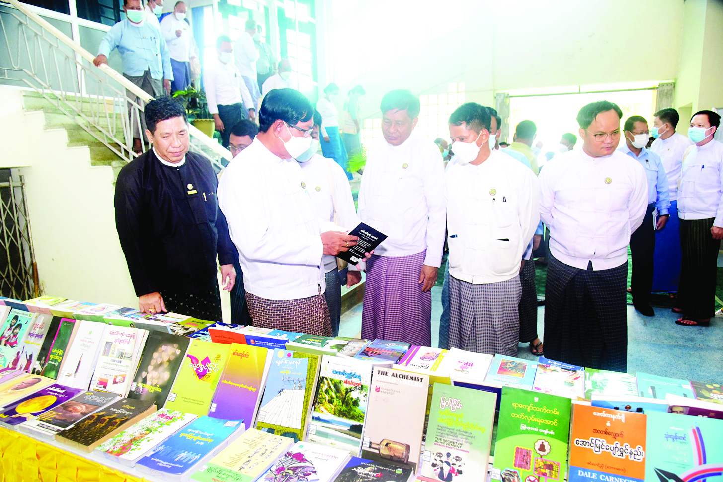 အခမ်းအနားအပြီးတွင် တိုင်းဒေသကြီးဝန်ကြီးချုပ်နှင့်အဖွဲ့သည် ခင်းကျင်းပြသထားသည့် စာအုပ်များနှင့် နံရံကပ်ပိုစတာများကို လှည့်လည်ကြည့်ရှုကြသည်။