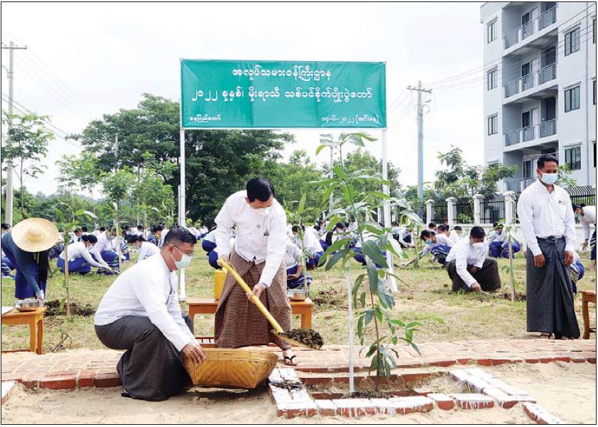 ဆက်လက်၍ ပြည်ထောင်စုဝန်ကြီးနှင့်အဖွဲ့သည် ရုံးအမှတ် (၅၁)တွင် ပြည်ထောင်စုဝန်ကြီးရုံး အလုပ်ရုံနှင့်အလုပ်သမား ဥပဒေစစ်ဆေးရေးဦးစီးဌာနနှင့် အလုပ်သမားရေးရာဆက်ဆံရေးဦးစီးဌာနတို့မှ အရာထမ်း၊ အမှုထမ်းများက ရွှေသပြေ ၁၀၊ စိန်ပန်းပင် ၂၀၊ စိန်တစ်လုံးသရက် ၄၅ ပင်၊ တမာပင် ၂၀စုစုပေါင်း ၉၅ ပင် စိုက်ပျိုးနေမှုကို လှည့်လည် ကြည့်ရှုအားပေးသည်။