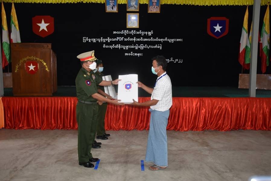 PDF အပါအဝင် အဖွဲ့အစည်း အမျိုးမျိုးတို့အနေဖြင့် နိုင်ငံတော်၏ ရှေ့လုပ်ငန်းစဉ်များတွင် ပါဝင်ပူးပေါင်းဆောင်ရွက်နိုင်ရေး သတ်မှတ်စည်းကမ်းချက်များနှင့်အညီ ဥပဒေဘောင် အတွင်းသို့ လက်နက်အပ်နှံပြီး ပြည်သူ့ဘဝသို့ ပြန်လည်ဝင်ရောက်ခြင်း ပြုမည်ဆိုပါက ကြိုဆိုလက်ခံသွားမည်ဖြစ်ကြောင်း နိုင်ငံတော်အစိုးရက ထုတ်ပြန်ထားပြီးဖြစ်ရာ ပြစ်မှု ကျူးလွန်ခဲ့ခြင်းမရှိသော PDF အဖွဲ့ဝင်များက တိုင်းဒေသကြီးနှင့် ပြည်နယ်အသီးသီး၌ ဥပဒေဘောင်အတွင်း ပြန်လည်ဝင်ရောက်လျက်ရှိကြသဖြင့် သက်ဆိုင်ရာ တာဝန်ရှိသူများက ၎င်းတို့၏ မိဘအုပ်ထိန်းသူများထံသို့ လွှဲပြောင်းအပ်နှံပေးလျက်ရှိကြောင်း သတင်းရရှိသည်။